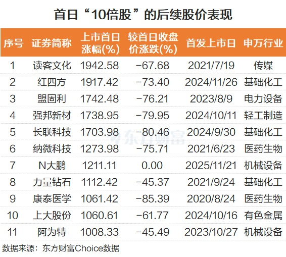 全新妙想投研助理,立即体验 A股三大指数11月21日集体大跌,而新股N大鹏上市首日却一路狂飙,盘中最高时大涨1666.67%,至收盘时上涨1211.11%,成为2025年首家上市首日的“10倍股”。 资料显示,大鹏工业是工业精密清洗领域专用智能装备生产商,产品及服务主要应用于车辆动力总成、新能源三电系统等核心零部件的精密清洗领域。客户包括比亚迪、长安集团、吉利汽车等。同时公司加速布局机器视觉检测产品,形成企业发展的第二曲线。 据招股书,2022~2024年及2025前三季度,大鹏工业实现营收分别为2.47亿元、2.6亿元、2.65亿元、1.81亿元;归母净利润分别为4088.58万元、4869.17万元、4348.61万元、3215.9万元。 而对于N大鹏首日股价的大涨,一位私募基金高管对深圳商报表示,该股上市流通市值较低,仅1.22亿元;发行市盈率为14.52倍,明显低于行业平均水平。流通市值叠加估值优势,再加上公司有机器视觉的概念,引发了游资的疯狂炒作。 ![]() 曾经的“首日10倍”股咋样了? 自2019年7月22日首批科创板公司上市以来,丁冬财经Choice数据显示,包括前述N大鹏在内,A股有11股上市首日涨幅超过1000%。其中创业板公司读客文化以1942.58%的首日涨幅居首。沪市主板公司红四方紧随其后,上市首日大涨1917.42%。同样来自创业板的盟固利排在第三位,上市首日大涨1742.48%。 不过在首日取得“10倍”后,这些“10倍股”后续的股价表现却不太让人满意,均出现了大幅回调的情形。比如康泰医学、长联科技,在首日录得十倍涨幅后,最新收盘价较上市首日收盘价均跌幅超过80%。红四方、盟固利、强邦新材、纳微科技下跌超过70%。跌最少的力量钻石也跌超40%。 ![]() 年内新股首日表现亮眼 从打新的角度来看,若以新股上市首日的股价表现来看,年内打新收益还是不错的。丁冬财经Choice数据显示,截至11月21日首发上市的N大鹏,年内的96只新股上市首日悉数上涨,其中85股上市首日翻倍,涨最少的中策橡胶也涨了6.84%。整体而言,96只新股的上涨中位数为227.53%。 从单签(沪深两市为500股/签,北交所为100股/签)盈利来看,按上市首日收盘价计算,影视创新为年内中签盈利最高个股,为64865元。弘景光电、同宇新材、矽电股份的单签盈利也超过5万元。 ![]() 有效申购户数明显复苏 在新股中签盈利概率大增,以及指数震荡拉升的背景下,市场的打新人气也复苏明显。以创业板为例,当前新股打新的网上申报有效申购户数大约在1300万户左右,而在2023年二季度到2024年三季度这一段行情下行期,创业板新股的网上申报有效申购户数只有800万户左右,增幅大约超过了60%。 ![]() 展望后市,华宝证券认为,随着注册制制度的进一步完善,新股发行将更加市场化、常态化,同时也将继续服务于国家产业升级和科技创新战略,为投资者提供更多打新机会。“同时,市场制度的优化,如进一步完善交易规则、提升市场流动性等举措,有望提升新股上市后的表现,为打新收益提供支撑。” 安永华中区审计主管合伙人费凡则指出,当前A股的科技属性愈发显著,资本市场正加速向科创型企业集聚。证监会近期多次强调更大力度支持优质未盈利科技企业上市,表明科创型企业的制度性红利正在加速释放,上市融资环境持续优化。