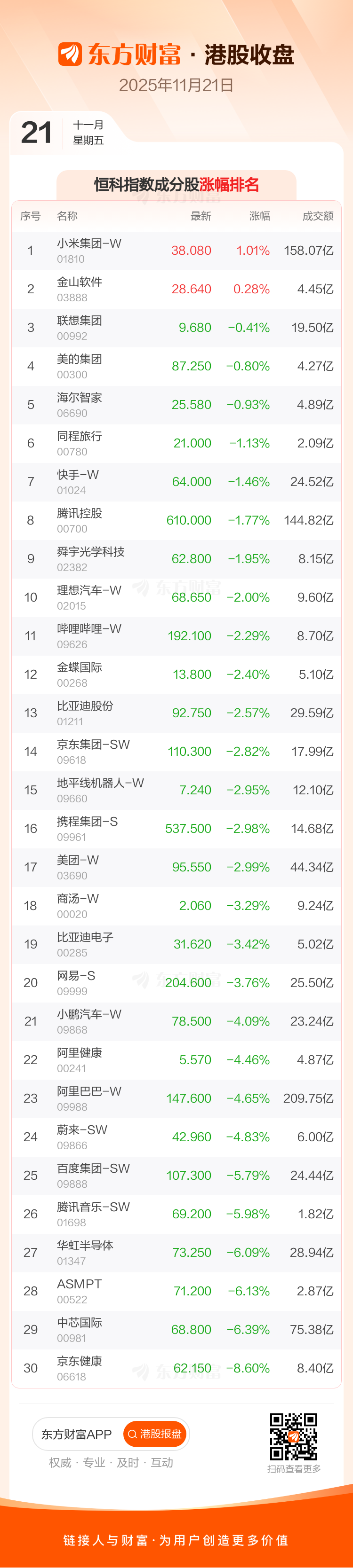 港股11月21日收盘走低,恒生指数收报25220.02点,跌615.55点,跌幅2.38%;恒生科技指数收报5395.49点,跌179.1点,跌幅3.21%。恒生指数成分股中龙湖集团、小米集团-W、中国电信涨幅居前,京东健康、信义光能、领展房产基金跌幅靠前。恒生科技指数成分股中小米集团-W、金山软件、联想集团涨幅居前,京东健康、中芯国际、ASMPT跌幅靠前。
