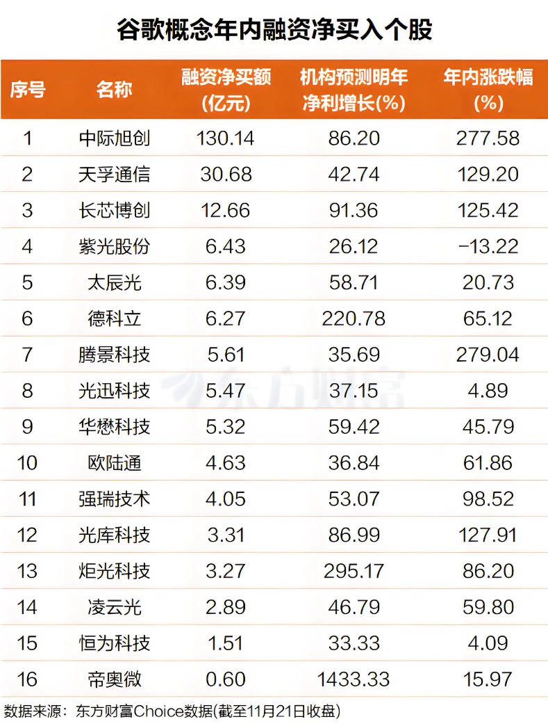 谷歌又迎重磅利好消息!据澎湃新闻,当地时间11月20日,谷歌旗下图像生成模型Nano Banana在推出三个月后迎来重磅更新,基于谷歌最新大模型Gemini 3 Pro搭建的Nano Banana Pro正式亮相。同时,谷歌为用户提供了更简单的数字水印验证方式,提高AI内容的透明度。 据介绍,Nano Banana Pro能够“以空前的控制力、改进的文字呈现和增强的世界知识,将用户的构想变成工作室级的设计”,不仅在细节表现力、图像分辨率和文本渲染准确性方面均有升级,还能以不同风格、字体和语言生成文本。 此前谷歌AI旗舰应用Gemini 3 Pro在多方评测中都备受好评,测试数据在一众大模型中一骑绝尘。 此外伯克希尔·哈撒韦于2025年11月14日盘后向SEC提交了 2025年第三季度 (截至9月30日) 的13F报告,文件中明确披露:首次建仓谷歌 A 类股 (GOOGL):买入约1785万股,持仓市值43.4亿美元(约合308亿元人民币),成为伯克希尔的第十大重仓股,占其投资组合的 1.62%。 业内人士表示,巴菲特旗下的伯克希尔建仓谷歌,表明对谷歌生态的看好。 杠杆资金年内抢筹多只高预增股 东方财富Choice数据显示,今年以来,谷歌概念股中获得杠杆资金净买入,且明年机构一致预测净利润增长率为正的上市公司共计有16家。 其中光模块龙头中际旭创排名第一,年内至今融资净买额超130亿元,机构预测明年净利润增长超86%;天孚通信排名第二,融资净买额超30亿元,机构预测明年净利润增长超42%。 长芯博创、紫光股份、太辰光、德科立、腾景科技、光迅科技、华懋科技、欧陆通、强瑞技术等个股年内融资净买额在13亿元至4亿元之间不等。 光库科技、炬光科技、凌云光、恒为科技、帝奥微等个股年内融资净买额在3.3亿元至6000万元之间不等。 而从机构预测明年净利润增长幅度看,帝奥微排名第一,机构预测净利润增长超1400%;炬光科技、德科立机构预测净利润增长超200%;长芯博创、光库科技、中际旭创、华懋科技、太辰光、强瑞技术机构预测净利润增长率在91%至50%之间不等。 ![]() 对于光模块龙头中际旭创,上海证券研报显示,公司绑定北美云巨头,占据高端市场主导权。:中际旭创是谷歌其第一大光模块供应商,800G光模块份额超 50%。此外也是亚马逊800G 光模块主要供应商之一,份额约 30%-40%(与新易盛竞争)。 机构:建议重视谷歌AI算力产业链 值得注意的是,谷歌大模型在硬件上使用自家TPU训练。另据财联社,日前谷歌正式发布第七代TPU Ironwood,该芯片将于未来几周内正式上市。 这款芯片由谷歌自主设计,可处理从大型模型训练到实时聊天机器人和AI智能体运行的各种任务。该芯片最初于今年4月亮相,用于测试与早期部署。 架构上,谷歌借助OCS(光交换机)组网提高了集群整体效率。OCS交换机利用光信号直接传输数据,避免了信号的转换过程,从而减少了延迟和能量消耗,因此适用于大规模数据中心之间的高速互联,尤其是在跨区域扩展和大规模AI算力需求下表现出极大优势。 中泰证券研报建议重视谷歌AI算力产业链和OCS技术创新带来的投资机会,重点关注中际旭创,长芯博创,腾景科技,德科立,光库科技,炬光科技,赛微电子,凌云光、光迅科技等。 民生证券认为,随着谷歌新模型的发布且基于自研TPU训练,在大幅降低模型训练成本的基础上表现出强劲的性能,有望率先跑通ROI,实现商业闭环。展望未来,谷歌有望成为本轮AI革命的领军企业。此外,谷歌的OCS定制化网络使其整个网络的吞吐量提升了30%,功耗降低了40%,数据流完成时间缩短了10%,网络宕机时间减少50倍,且资本开支减少30%。