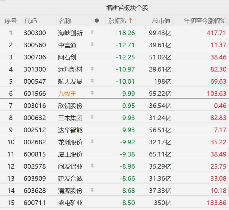 格隆汇11月21日|A股市场福建股集体下挫,其中,海峡创新跌超18%,中富通(300560)、阿石创(300706)跌超12%,远翔新材跌近11%,航天发展(000547)、九牧王(601566)、欣贺股份、三木集团(000632)、达华智能(002512)、龙洲股份(002682)10CM跌停,厦工股份逼近跌停,闽发铝业(002578)、建发合诚、清源股份(603628)、盛屯矿业(600711)跌超8%。