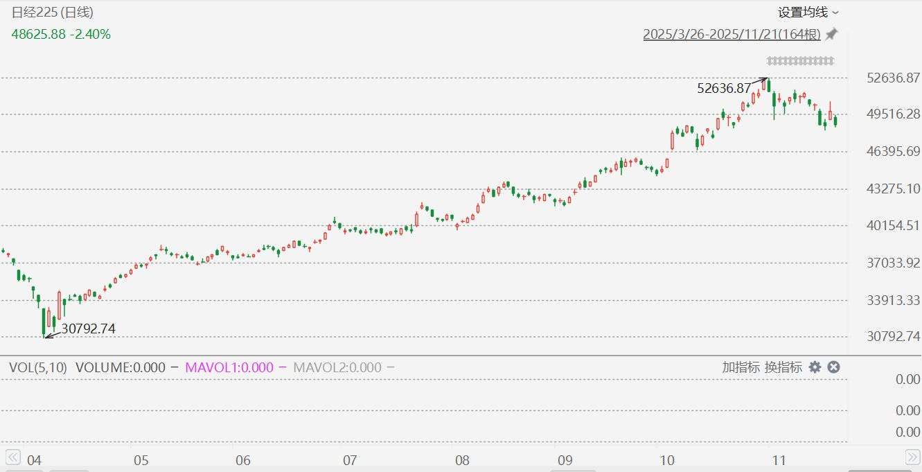 格隆汇11月21日|日经225指数收盘下跌1198.06点,跌幅2.40%,报48625.88点。本周累跌3.48%。
