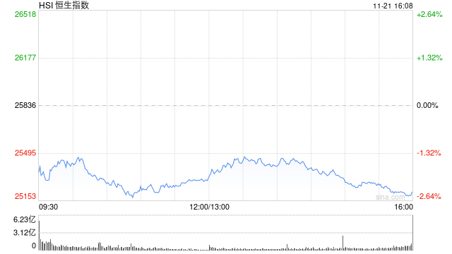 11月21日消息,港股三大指数震荡走低。截至收盘,恒生指数跌2.38%,报25220.02点,恒生科技指数跌3.21%,国企指数跌2.45%。盘面上,科网股全线下跌,百度跌超5%,阿里巴巴跌超4%,网易跌超3%,美团、哔哩哔哩、京东跌超2%;光伏太阳能股普跌,信义光能跌超7%;半导体板块走弱,华虹半导体跌超6%;中资券商股跌幅居前,东方证券跌超6%。