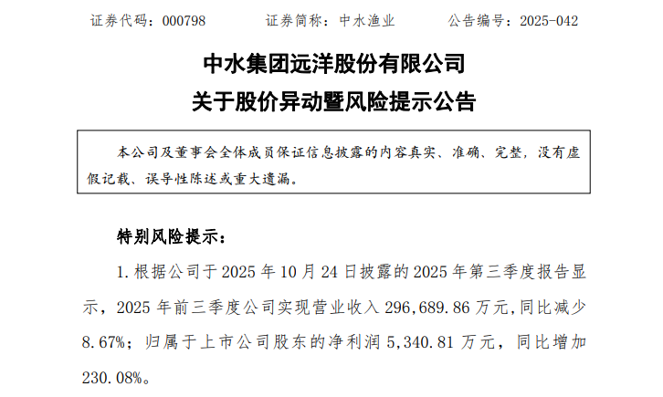 6连涨停!中水渔业最新发声:股价存在大幅上涨后回落风险 K 线图 特色数据 资金流向 公告 个股日历 核心题材 ![]() ![]() 最新价:15.09 涨跌额:1.37 涨跌幅:9.99% 成交量:96.8万手 成交额:14.2亿 换手率:26.46% 市盈率:77.53 总市值:55.2亿 查询该股行情 实时资金流向 深度数据揭秘 进入中水渔业吧 中水渔业资金流 专业金融数据,下一代智能终端 连续录得六涨停后,11月23日晚间,中水渔业(000798)披露关于股价异动暨风险的提示公告。 11月14日至11月21日间的六个交易日内,中水渔业股价从最低8.54元/股涨至15.09元/股,累计涨幅近77%。 ![]() 23日晚间公告中该公司表示,2025年11月20日、11月21日连续两个交易日收盘价涨幅偏离值累计超过20%,根据深圳证券交易所股票交易规则的相关规定,属于股票交易异常波动的情形。 据核实,公司前期披露的信息不存在需要更正、补充之处;公司未发现近期公共传媒报道了可能或已经对本公司股票交易价格产生较大影响的未公开重大信息;近期公司经营情况及内外部经营环境未发生重大变化;公司、控股股东和实际控制人不存在关于本公司的应披露而未披露的重大事项,或处于筹划阶段的重大事项;公司控股股东、实际控制人在股票交易异常波动期间不存在买卖公司股票的情形。 ![]() 公开资料显示,中水渔业是由中国农业发展集团有限公司作为实际控制人,以远洋捕捞业和加工贸易业为主业的股份制上市企业,是我国远洋渔业的开拓者和排头兵,资产规模位居我国远洋渔业企业前列。公司主要业务有远洋捕捞、渔业服务、水产品加工与贸易等,拥有各类渔船及辅助类作业船舶300余艘,在国内建有舟山、烟台2个远洋渔业基地,在20多个国家和地区建有40多个分支机构,形成了境外投资项目多、船队规模大、地域跨度广、产业体系完善的全球化布局。公司远洋捕捞作业区域遍布大西洋、太平洋、印度洋和南极海域,涉及近20个国家的专属经济区,年捕捞量20多万吨,主要捕捞品种包括金枪鱼、鱿鱼、软体鱼、硬体鱼、虾、蟹、贝类等。公司渔业服务板块涵盖海上冷藏运输、油料补给等业务,拥有大型运输补给船舶10余艘,年运输能力和海上供油能力均超过20万吨。 对于近期股价异动,中水渔业提示,根据公司于2025年10月24日披露的2025年第三季度报告显示,2025年前三季度公司实现营业收入29.67亿元,同比减少8.67%;归母净利润5340.81万元,同比增加230.08%。 公司最新滚动市盈率77.53倍,市净率为13.48倍,公司当前的市盈率、市净率与同行业平均水平有较大差异。公司不存在应披露未披露的信息。 公司近期股票交易异常波动,可能存在非理性交易行为,交易风险较大,存在股价大幅上涨后回落的风险。 该公司表示,公司将严格按照有关法律法规的规定和要求,认真履行信息披露义务,及时做好信息披露工作。本公司郑重提醒广大投资者,应当切实提高风险意识,防范概念炒作,谨慎决策,注意投资风险。 全新妙想投研助理,立即体验 (文章来源:证券时报网) |