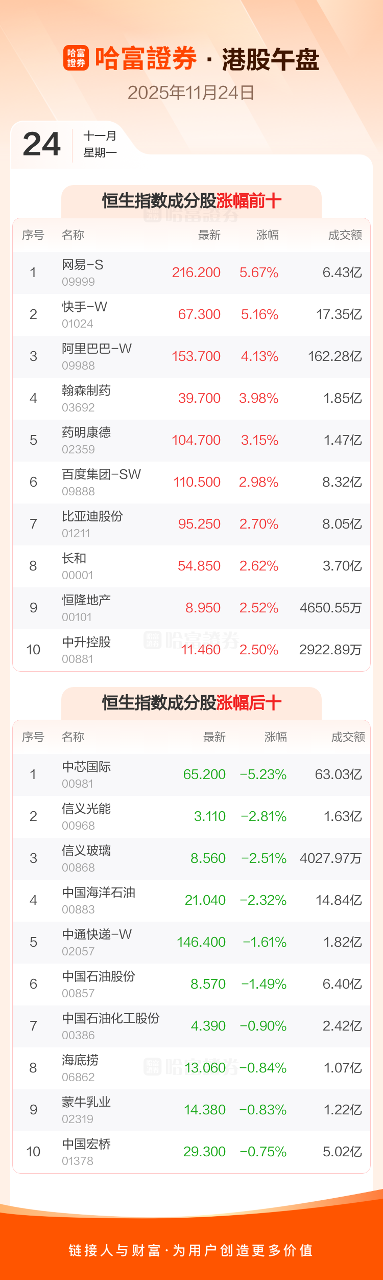 港股11月24日午盘走高,恒生指数收报25578.88点,涨358.86点,涨幅1.42%;恒生科技指数收报5484.46点,涨88.97点,涨幅1.65%。恒生指数成分股中网易-S、快手-W、阿里巴巴-W涨幅居前,中芯国际、信义光能、信义玻璃跌幅靠前。恒生科技指数成分股中网易-S、快手-W、阿里巴巴-W涨幅居前,华虹半导体、中芯国际、ASMPT跌幅靠前。