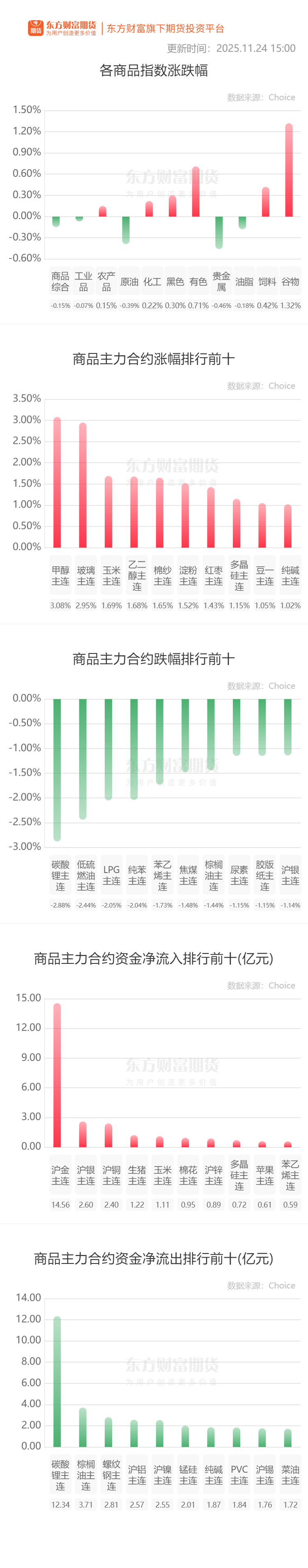 行情纵览![]() 宏观产经财联社:国家能源局发布1-10月份全国电力工业统计数据。截至10月底,全国累计发电装机容量37.5亿千瓦,同比增长17.3%。其中,太阳能发电装机容量11.4亿千瓦,同比增长43.8%;风电装机容量5.9亿千瓦,同比增长21.4%。1-10月份,全国发电设备累计平均利用2619小时,比上年同期降低260小时。 中国人民银行:央行今日开展3387亿元7天逆回购操作,投标量3387亿元,中标量3387亿元,操作利率为1.40%,与此前持平。 品种资讯黑色系期货 铁矿石:2025年11月17日-11月23日全球铁矿石发运总量3278.4万吨,环比减少238.0万吨。澳洲巴西铁矿发运总量2637.4万吨,环比减少271.3万吨。澳洲发运量1839.6万吨,环比减少210.9万吨,其中澳洲发往中国的量1553.6万吨,环比减少319.4万吨。巴西发运量797.8万吨,环比减少60.4万吨。 2025年11月17日-11月23日中国47港铁矿石到港总量2939.5万吨,环比增加569.6万吨;中国45港铁矿石到港总量2817.1万吨,环比增加548.2万吨;北方六港铁矿石到港总量1438.3万吨,环比增加397.0万吨。(我的钢铁网) 焦煤:11月24日蒙古国小TT公司炼焦煤进行线上竞拍,蒙4#原煤A12.6,V26.05,S0.61,G60.1,Mt2.2起拍价110美元/吨,较上期11月18日持平,挂牌数量12.8万吨全部流拍,以上价格均不含税。供货地点为甘其毛都口岸海关监管区,供货时间为付款后90天内,最后供应日期为2026年2月22日。(我的钢铁网) 农产品期货 生猪:据农业农村部监测,截至11月24日14:00时,全国农产品批发市场猪肉平均价格为17.92元/公斤,较上周五上升0.1%;鸡蛋平均价格为7.35元/公斤,较上周五上升1.2%。(新华财经) 大豆:上周全国主要油厂开机率继续回升,大豆周度压榨量升至230万吨以上高位,预计本周压榨量仍在230万吨左右。根据油厂压榨情况监测,11月1-21日全国主要油厂大豆压榨量约620万吨,预计11月全月国内主要油厂大豆压榨量在870万吨左右。(国家粮油信息中心) 有色/贵金属期货 沪银:据海关数据显示,2025年10月银锭(纯度≥99.99%未锻造银)出口量652.8吨,环比增长19.45%,同比增长76.58%。其中,进料加工方式的银锭出口478.59吨,占比约91.75%。2025年银锭累计出口4291.17吨,累计同比增长21.12%。(上海有色网) 氧化铝:据Mysteel调研了解,新疆最新氧化铝现货招标1万吨,中标价格为3120-3130元/吨(到厂价),北方地区货源。(我的钢铁网) 工业硅:11月24日,华东不通氧553#在9300-9400元/吨;通氧553#在9400-9600元/吨;521#在9600-9700元/吨;441#在9600-9800元/吨;421#在9600-9900元/吨;421#有机硅用在9800-10200元/吨;3303#在10300-10600元/吨。黄埔港、天津、西北、新疆、上海地区部分硅价也下调。昆明、四川地区硅价持稳。97硅今日价格同样持稳。(上海有色网) 能化期货 尿素:山东地区尿素行情僵持偏弱,小颗粒主流出厂成交1580-1640元/吨,大颗粒出厂成交1840元/吨。临沂市场一手贸易商出货参考价格1640元/吨附近,菏泽市场参考价格1630元/吨附近。联盟一套装置检修几日,省内其它企业生产基本正常。(隆众资讯) 玻璃:11月14日-11月20日,剔除长停样本,中国LOW-E玻璃样本企业开工率环比持稳于76.2%,处于近几年同期低位;不剔除样本情况下,本期LOW-E开工率46.5%,环比持平。(隆众资讯) 乙二醇:截至11月24日华东主港地区MEG库存总量66.85万吨,较上一期增加3.55万吨。(隆众资讯) 纯碱:截止到2025年11月24日,本周国内纯碱厂家总库存161.57万吨,较上周四下降2.87万吨,跌幅1.75%。其中,轻质纯碱74.08万吨,环比下降1.63万吨,重质纯碱87.49万吨,环比下降1.24万吨。(隆众资讯) 烧碱:山东省内液碱市场走货不畅,多数企业暗降出货,主要下游卸车不畅,周末压价10至710采购后,省内各厂价格继续跟跌,低价甚至跟主要下游同价。鲁西南32%离子膜碱主流成交720-740;鲁中东部32%离子膜碱主流成交720-790,50%离子膜碱主流成交1220-1320;鲁北32%离子膜碱主流成交750-830;鲁南32%离子膜碱主流成交770-810。(单位:元/吨)(隆众资讯) 晚间关注无 (文章来源:丁冬财经研究中心) |