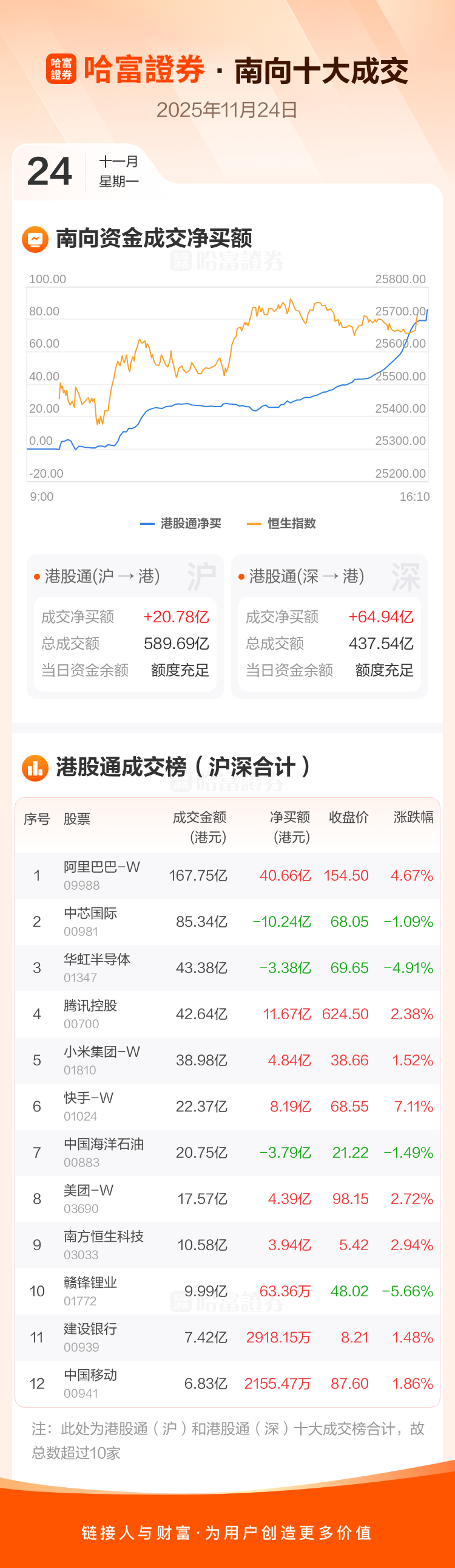 恒生指数11月24日涨1.97%,收报25716.5点。南向资金今日净买入港股85.71亿港元。南向资金今日成交额1027.23亿港元,港股大市成交3026.42亿港元。