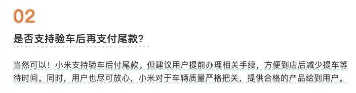 图片来源:小米汽车微信公众号2024年5月1日发文截图 2024年5月1日,小米汽车微信公众号发布的《小米SU7答网友问(第三十四集)》中表示,“小米支持验车后付尾款。但建议用户提前办理相关手续,方便到店后减少提车等待时间。同时,用户也尽可放心,小米对于车辆质量严格把关,提供合格的产品给到用户”。 对于提前催交尾款的原因,多位北京地区小米汽车销售人员今年8月在接受记者采访时曾解释称,这仅针对部分有特殊情况的准车主。“只是针对提出过延迟交付,或评估有较高提车风险的用户。比如办理金融分期时配合度较低,或表达过有不想提车想法的。”小米汽车销售人员称。 一位接近小米汽车的知情人士也曾对记者表示,正常情况下,小米汽车的车主是在车辆生产完成、即将交付时才最终付款,但有两种特殊情况可能需要提前支付部分款项。 “第一种是客户主动要求延迟排产,车辆即将下线、客户希望推迟提车时间,可能会要求客户缴纳一笔约2万至3万元的保证金。这笔钱会存入监管账户,车辆将重新安排生产计划。如果客户最终放弃购车,保证金可原路退回,但定金则按规则不退还。第二种情形与评估客户的提车意愿风险相关。只有当客户存在较高的不提车可能性时,才会要求提前支付尾款或1万到2万元的首付。”上述接近小米汽车的知情人士表示。