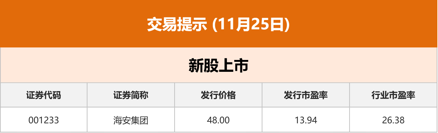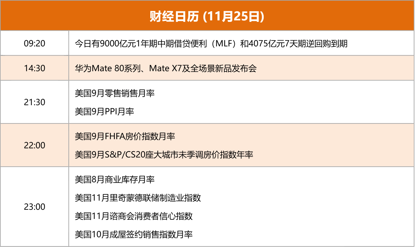 公司新闻小米集团:小米集团创始人、董事长兼CEO雷军个人斥资超1亿港元增持小米集团260万股,平均价为每股约38.58港元,雷军持股比例增加至23.26%。本月,小米集团已分别于20日和21日连续两日回购公司股票2150万股,总斥资金额超8亿港币。 易点天下:经核查,公司控股股东、实际控制人邹小武之一致行动人宁波众点易企业管理合伙企业(有限合伙)在股票异动期间存在卖出公司股票的行为。本次减持与此前已披露的意向、减持计划一致。 中际旭创:公司董事、常务副总裁王晓东减持计划期限已届满,减持区间2025年8月27日-2025年11月24日,累计减持70.86万股,减持均价414.24元/股,占公司总股本的0.06%。 龙蟠科技:公司控股子公司常州锂源及控股孙公司南京锂源(合称为“卖方”)与楚能新能源全资子公司武汉楚能、孝感楚能及宜昌楚能(合称为“买方”)共同签署了《之补充协议二》,对原协议相关条款进行补充与修订。如按照预计数量及市场价格估算,《补充协议二》与《原协议》总销售金额超人民币450亿元。《补充协议二》自2025年11月24日起生效。 方大炭素:公司拟作为产业协同方参与杉杉集团有限公司及其全资子公司宁波朋泽贸易有限公司的实质合并重整投资人招募。 东珠生态:公司近日收到驻马店中院送达的《传票》,中国地质因建设工程施工合同纠纷,对公司及汝南县住建局提起诉讼,涉案金额5.52亿元。 中原内配:公司拟以0元价格受让焦作通财持有的河南空天产业基金对应认缴出资5000万元(实缴出资额0元)的合伙份额,并作为有限合伙人与河南空天产业基金其他合伙人签订合伙协议,履行出资义务。河南空天产业基金于2025年9月6日成立。截至目前,河南空天产业基金合伙人已实缴出资2.81亿元。 天齐锂业:全资子公司天齐智利因不服智利圣地亚哥上诉法院(简称“智利法院”)判决,于智利当地时间2025年11月21日通过智利法院向智利最高法院提起上诉。天齐智利提起的诉讼申请暂未提及具体金额。 恒辉安防:公司机器人相关业务聚焦核心部件的定制化研发与适配,目前已根据国内外客户需求,向多家机器人企业开展送样及技术交流。其中,柔性关节保护件(如腰封件、脖颈头盔包覆件)、防护手套等产品已实现人形机器人场景的商品化交付,部分产品进入小批量交付阶段。 >">点击查看更多上市公司重大公告>> 环球市场美联储理事沃勒主张12月降息:当地时间周一(11月24日),美联储理事沃勒表示,他主张在12月实施一次降息,不过之后的政策路径应采取逐次会议的形式。沃勒周一在接受采访时称:“就我们的双重使命而言,我主要担忧的是劳动力市场,所以我在倡导在下次会议上降息。” 德国总理预计美方和平计划无法在27日前最终确定:德国总理默茨24日表示,预计美国提出的乌克兰和平计划不会在27日前得到最终确定。此前,美国总统特朗普称,希望乌克兰最晚本月27日接受该计划,有可能会视情况延后,但27日是一个“合适”的日期。默茨表示,未来几天不会出现突破性进展,而只会取得小规模进展,因为乌克兰的和平不会一蹴而就。默茨表示,在23日举行的乌克兰问题日内瓦会谈期间,美国提出的和平计划进行了很多修改,他强调,任何影响欧洲利益的决定都不应在没有欧盟参与的情况下做出。 乌外交部称和平计划涉欧盟与北约议题可能会纳入独立谈判:乌克兰外交部发言人泰希表示,乌方认为,可能会就和平计划中涉及欧盟和北约的问题单独开辟谈判路径。泰希指出,乌克兰的立场始终是维护伙伴国家间的团结。“若有人企图挑拨欧美关系,唯一受益方将是俄罗斯。各方都应清醒认识到这一点。在这项工作中,任何根本性关键要素都不容忽视。”乌克兰将美国和平提议视为工作基础,其中欧洲扮演重要角色。 交易提示![]() 点击立即参与申购>> 债市纵览Shibor:11月24日,隔夜shibor报1.3160%,下跌0.40个基点;7天shibor报1.4470%,上涨3.00个基点;14天shibor报1.5420%,上涨2.00个基点;1月shibor报1.5200%,上涨0.10个基点;3月shibor报1.5800%,上涨0.20个基点。 欧债:欧市尾盘,英国10年期国债收益率跌0.6个基点,报4.540%。德国10年期国债收益率跌1.1个基点,报2.692%。法国10年期国债收益率跌2.4个基点,报3.448%。意大利10年期国债收益率跌1.8个基点,报3.441%。西班牙10年期国债收益率跌1.2个基点,报3.197%。希腊10年期国债收益率跌1.6个基点,报3.306%。 美债:纽约尾盘,美国10年期基准国债收益率跌2.69个基点,报4.0363%,日内交投于4.0671%-4.0306%区间。两年期美债收益率跌0.64个基点,报3.5011%,日内交投于3.5307%-3.4990%区间。20年期美债收益率跌3.40个基点,30年期美债收益率跌3.35个基点。三年期美债收益率跌1.12个基点,五年期美债收益率跌1.57个基点,七年期美债收益率跌2.33个基点。 商品期货国内期货:11月24日,国内商品期货收盘涨跌不一,甲醇涨超3%,玻璃涨超2%,乙二醇、玉米、淀粉、棉纱、红枣、多晶硅、纯碱涨超1%。跌幅方面,碳酸锂、LU燃油、液化气、纯苯跌超2%,苯乙烯、焦煤、棕榈油、沪银、原油跌超1%。 国际金属:LME期铜收跌4美元,报10773美元/吨。LME期铝收涨26美元,报2812美元/吨。LME期锌收涨11美元,报3000美元/吨。LME期铅收跌2美元,报1984美元/吨。LME期镍收涨244美元,报14699美元/吨。LME期锡收涨489美元,报37384美元/吨。 国际农产品:纽约尾盘,彭博谷物分类指数跌0.35%,报30.0277点。CBOT玉米期货跌0.06%,报4.3725美元/蒲式耳