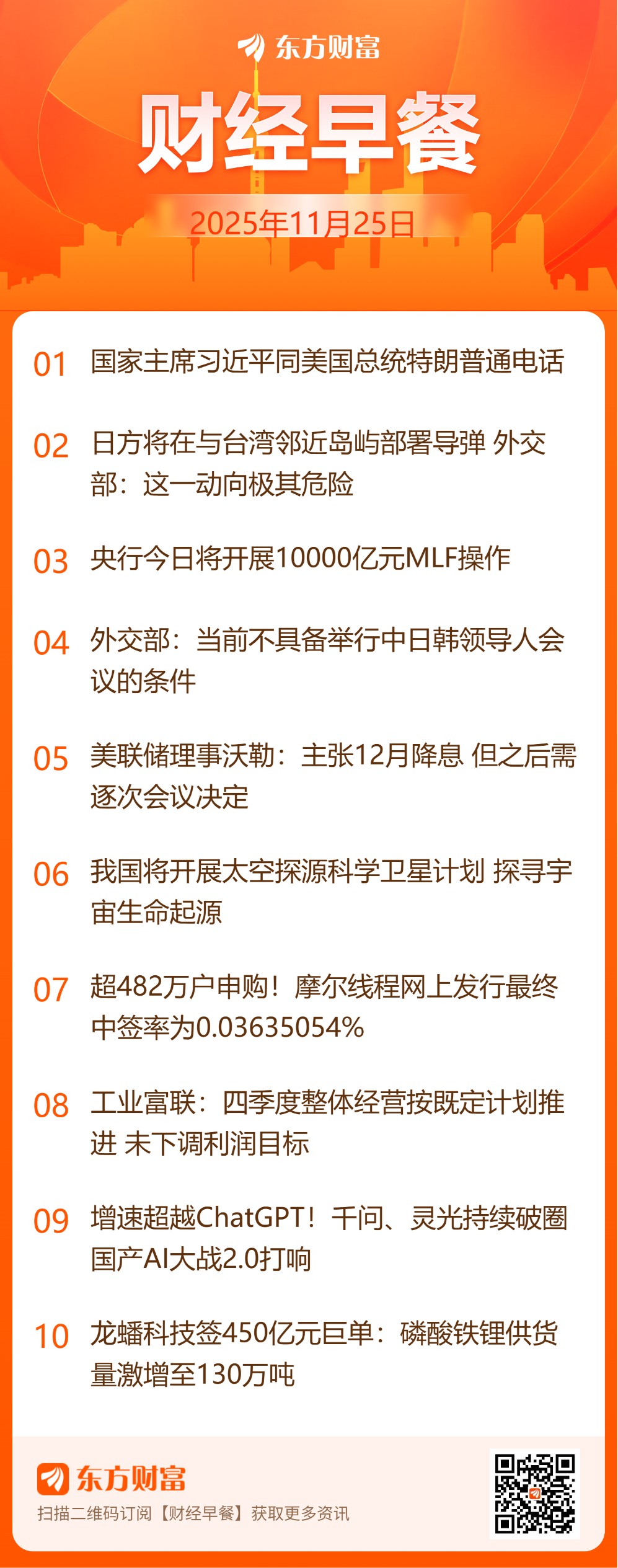 ![]() 每日精选中美元首通话: 11月24日晚,国家主席习近平同美国总统特朗普通电话。习近平指出,上个月我们在韩国釜山成功举行会晤,达成很多重要共识,为中美关系这艘巨轮稳健前行校准航向、注入动力,也向世界传递积极信号。釜山会晤以来,中美关系总体稳定向好,受到两国和国际社会普遍欢迎,事实再次说明,中美“合则两利、斗则俱伤”是经过实践反复验证的常识,中美“相互成就、共同繁荣”是看得见、摸得着的实景。双方要保持住这个势头,坚持正确方向,秉持平等、尊重、互惠态度,拉长合作清单、压缩问题清单,争取更多积极进展,为中美关系打开新的合作空间,更好造福两国人民和世界人民。习近平阐明了中方在台湾问题上的原则立场,强调台湾回归中国是战后国际秩序重要组成部分。中美曾并肩抗击法西斯和军国主义,当前更应该共同维护好二战胜利成果。两国元首还谈及乌克兰危机。习近平强调,中方支持一切致力于和平的努力,希望各方不断缩小分歧,早日达成一个公平、持久、有约束力的和平协议,从根源上解决这场危机。 外交部例行记者会: 11月24日,外交部发言人毛宁主持例行记者会。路透社记者提问,日本防卫大臣小泉进次郎11月23日视察琉球群岛一处自卫队基地时表示,日本将如期在该基地部署中程防空导弹。小泉进次郎称,“此次部署有助于降低我国遭受武装攻击的可能性,”并表示,“我不同意‘此次部署将加剧地区紧张局势’的说法。”中方对此有何回应?对此,毛宁表示,日方在与中国台湾邻近的西南诸岛部署进攻性武器,刻意制造地区紧张,挑动军事对立,联系到日本首相高市早苗的涉台错误言论,这一动向极其危险,需要引起周边国家及国际社会的高度警惕。 MLF: 为保持银行体系流动性充裕,中国人民银行11月24日发布预告称,将在25日以固定数量、利率招标、多重价位中标方式开展1万亿元中期借贷便利(MLF)操作,期限为1年期。鉴于11月有9000亿元MLF到期,当月央行MLF净投放规模将达到1000亿元,为央行连续第九个月对MLF加量续作。中信证券首席经济学家明明表示,当月MLF延续净投放,配合买断式逆回购超额续作,两类工具共计释放长期流动性6000亿元,和10月的水准完全一致,央行流动性立场维持宽松。 摩尔线程中签率: 11月24日,被誉为“国产GPU第一股”的摩尔线程正式启动科创板发行,发行价定为114.28元/股,创下2025年以来A股新股发行价新高。初步询价阶段,共有267家网下投资者参与报价,涉及配售对象多达7555个,总申购股数超700亿股,网下申购倍数高达1572倍。摩尔线程公告,根据上交所提供的数据,本次网上发行有效申购户数为482.66万户,有效申购股数为462.17亿股,网上发行初步中签率为0.02423369%。回拨机制启动后,网上发行最终中签率为0.03635054%。 太空探索: 记者从11月24日举行的空间科学先导专项最新亮点成果发布会上获悉,“十五五”期间,聚焦宇宙起源、空间天气起源、生命起源等重大前沿问题,中国科学院国家空间科学中心将组织实施包含“鸿蒙计划”、“夸父二号”、系外地球巡天、增强型X射线时变与偏振空间天文台在内的太空探源科学卫星计划,力争在宇宙黑暗时代、太阳磁活动周、系外类地行星探测等领域实现新突破。 中日关系: 据央视新闻,24日,外交部发言人毛宁主持例行记者会。有记者就第十次中日韩领导人会议的会期提问,毛宁表示,中日韩三方并没有就第十次中日韩领导人会议的会期达成共识。近期日本领导人在涉台问题上公然发表错误言论,损害了中日韩合作的基础和氛围,导致当前不具备举行中日韩领导人会议的条件。 工业富联澄清: 工业富联发布澄清公告称,2025年11月24日,网络上流传关于富士康工业互联网股份有限公司(简称“公司”)“下调第四季度业绩目标”、“大客户在L10/L11商业模式上会有调整”等不实言论,引发部分关注。对此,公司澄清并郑重声明。经核实,公司针对网络平台流传事项声明如下:1、网络流传相关言论不属实。当前,公司第四季度整体经营,包括GB200、GB300等相关产品出货均按既定计划推进,客户需求持续畅旺,生产及出货一切正常,且目前未收到任何主要客户关于调整业务模式、下修份额或价格的要求。2、公司未向市场下调第四季度利润目标,不存在应披露未披露的信息。同时,与客户合作开发的下一代产品,也正在按前期的计划如期顺利推进当中。 油价下调: 国内成品油价迎年内第十次下调。11月24日,国家发改委发布消息称,自24时起,国内汽油价格和柴油价格分别下调70元/吨和65元/吨。折合升价,92号汽油下调0.05元,95号汽油和0号柴油均下调0.06元。此次调价后,私家车和物流企业用油成本均有所下降。 高盛最新研判: 高盛最新预计,美联储将在12月的会议上实施连续第三次降息。该行认为,通胀放缓以及劳动力市场降温,为政策制定者进一步放松货币政策提供了空间。高盛还预计,美联储2026年再降息两次,分别在3月和6月,最终将联邦基金利率降至3.00%–3.25%的区间。 热点题材AI应用: 11月24日,阿里巴巴方面最新披露,其自主研发的AI助手千问APP自11月17日开启公开测试以来,一周内应用下载量已突破1000万次。对比来看,这一增长速度超过了包括ChatGPT、Sora、DeepSeek在内的多款知名AI应用,市场反应强烈。 商业航天: 在日前召开的2025中国5G+工业互联网大会上,工业和信息化部正式启动