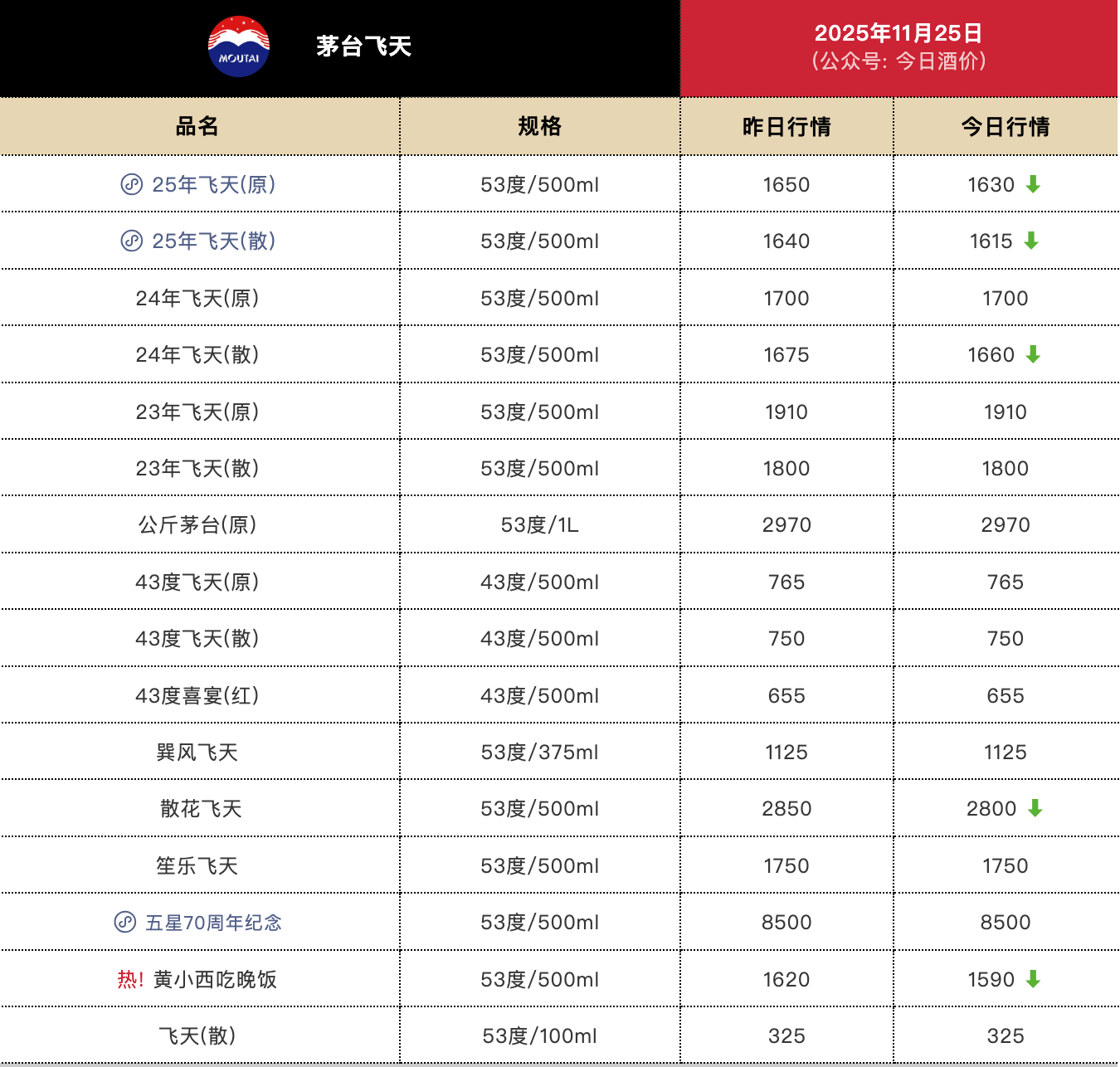 今日酒价披露的批发参考价显示,11月25日,25年飞天茅台原箱较前一日下跌20元,报1630元/瓶;25年飞天茅台散瓶较前一日下跌25元,报1615元/瓶。24年飞天茅台原箱较前一日持平,报1700元/瓶;24年飞天茅台散瓶较前一日下跌15元,报1660元/瓶。
