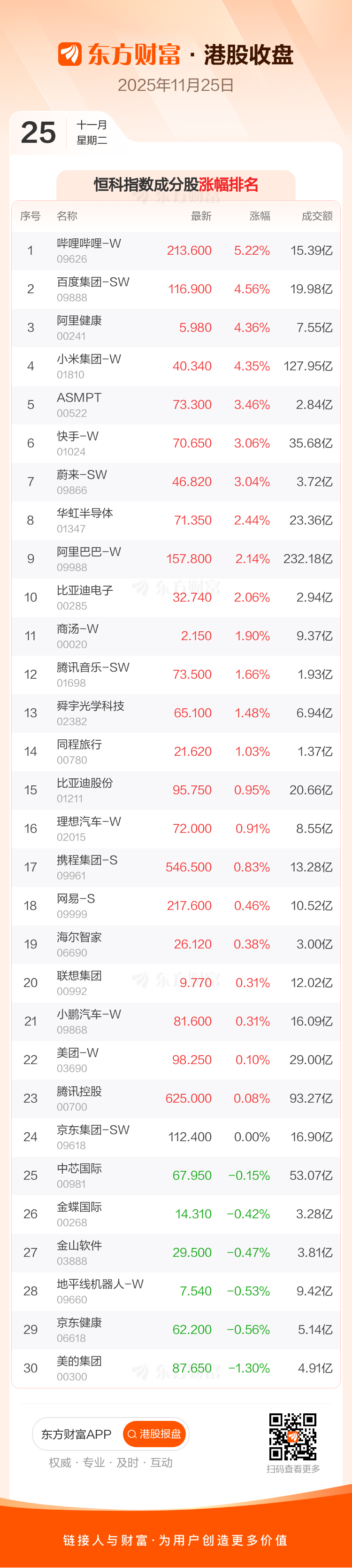 11月25日港股收盘:恒指涨0.69% 百度集团领涨成分股
