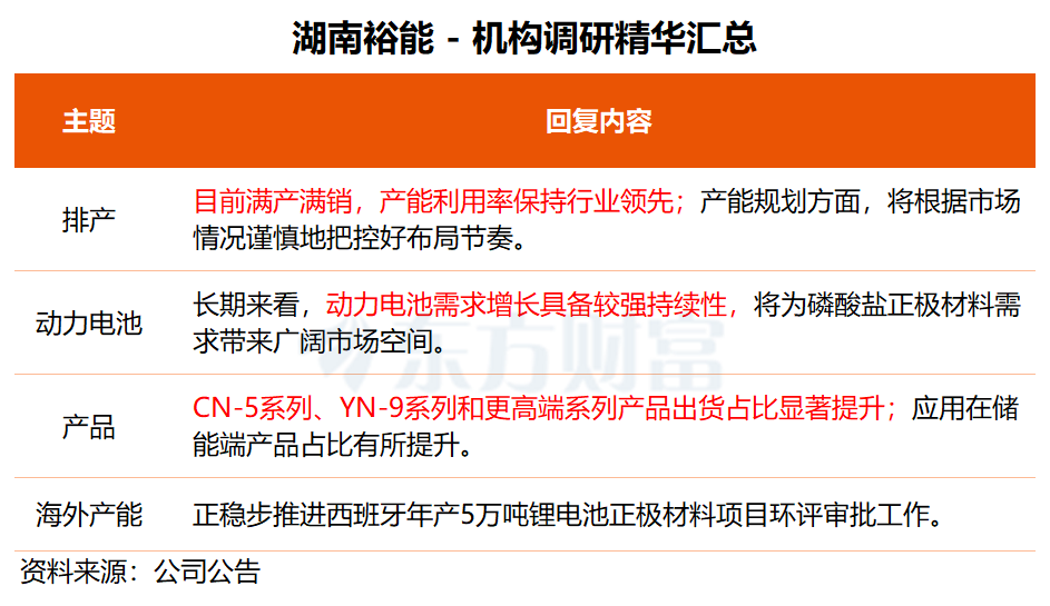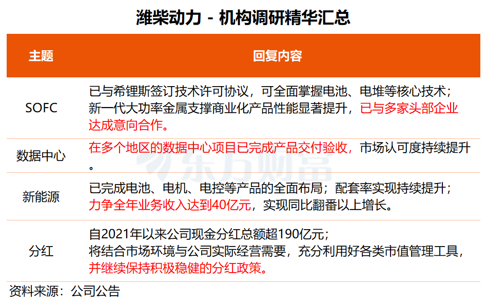 11月25日,潍柴动力和湖南裕能披露投资者关系活动记录表,其中透露出公司业务诸多进展与亮点。 潍柴动力:持续深耕SOFC领域 新能源业务力争全年收入翻番 潍柴动力于11月21日、24日接受博时基金、万泰华瑞投资等机构调研。 在调研中,潍柴动力表示,公司在SOFC(固体氧化物燃料电池)领域持续深耕,11月,公司与希锂斯在电池电堆层面签订技术许可协议,这意味着公司可全面掌握电池、电堆、系统、电站的核心技术。 近年来,潍柴动力聚焦AI数据中心、工业园区等核心场景,对标国际竞品推出新一代大功率金属支撑商业化产品,在发电效率、体积功率密度、可启停次数及启动速度等方面均有显著提升,凭借性能优势已与国内外多家头部企业达成意向合作,为规模化商用奠定基础。 在数据中心领域,潍柴动力表示,公司大缸径发动机在国内外多个地区的数据中心项目均已完成产品交付验收,国内外市场认可度持续提升。后续,公司将积极开拓国内外战略客户,推动市场份额持续提升。 今年前三季度,潍柴动力新能源动力系统业务实现收入19.7亿元,同比增长超80%。公司表示,将全力提速新能源业务发展,统筹推进新能源相关技术研发与产品落地,加速市场开拓与产品交付,力争全年业务收入达到40亿元,实现同比翻番以上增长。 ![]() 国泰海通近日研报指出,AIDC相关的柴发、天然气发动机业务是潍柴动力成长的重要推力,此外子公司KION的欧美物流设备业务也有望不断修复盈利能力。结合天然气重卡发动机的增长,以及出海业务,预计公司2025-2027年净利润分别为125亿、152亿、172亿元。 二级市场方面,潍柴动力股价今日上涨1.63%,本月涨幅为12.77%。 湖南裕能:高端产品出货占比提升 产能利用率保持行业领先 11月24日,湖南裕能接受泰康资产、民生证券等机构调研。 湖南裕能表示,长期来看,动力电池需求增长具备较强的持续性,这也将为磷酸盐正极材料需求带来广阔的市场空间。 “受益于下游动力电池和储能电池旺盛的需求,公司目前满产满销,产能利用率保持行业领先。”湖南裕能称,在产能规划方面,公司将根据市场情况谨慎地把控好布局节奏。 关于产品结构方面,据湖南裕能介绍,公司CN-5系列、YN-9系列和更高端系列等产品获得客户高度认可,出货占比显著提升,产品结构持续优化。与此同时,公司积极把握储能市场机遇,应用在储能端的产品占比也有所提升。 ![]() 今年前三季度,湖南裕能实现营收232.26亿元,同比增长46.27%,归母净利润为6.45亿元,同比增长31.51%;Q3营收88.68亿元,同比增长73.97%,归母净利润3.40亿元,同比增长235.31%。 华龙证券指出,公司是国内主要的锂离子电池正极材料供应商,专注于锂离子电池正极材料研发、生产和销售,出货量自2020年以来稳居行业第一,有望受益于下游动力及储能增长需求。 二级市场方面,湖南裕能股价今日上涨2.29%,本月涨幅为-5.83%。