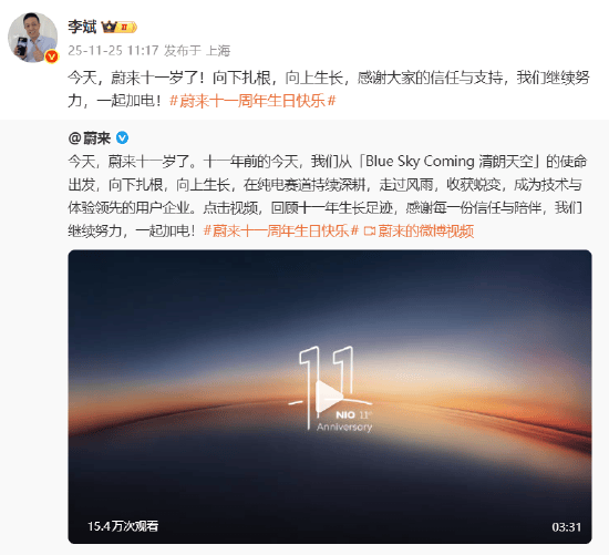 11月25日,今天是蔚来汽车成立第十一周年。蔚来发文称,十一年前的今天,我们从“Blue Sky Coming 清朗天空”的使命出发,向下扎根,向上生长,在纯电赛道持续深耕,走过风雨,收获蜕变,成为技术与体验领先的用户企业。“感谢每一份信任与陪伴,我们继续努力,一起加电!” 创始人李斌转发微博并表示,“今天,蔚来十一岁了!向下扎根,向上生长,感谢大家的信任与支持,我们继续努力,一起加电!”