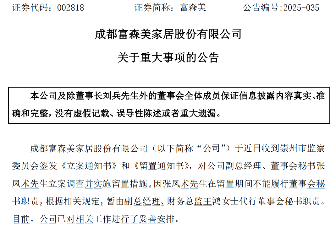 富森美(002818)11月25日晚间公告,公司于近日收到崇州市监察委员会签发《立案通知书》和《留置通知书》,对公司副总经理、董事会秘书张凤术立案调查并实施留置措施。 ![]() 公告显示,因张凤术在留置期间不能履行董事会秘书职责,根据相关规定,暂由副总经理、财务总监王鸿女士代行董事会秘书职责。目前,公司已对相关工作进行了妥善安排。 富森美表示,截至本公告披露日,公司董事会正常运作,公司及子公司生产经营情况正常,该事项不会对公司的生产经营产生重大影响。 张凤术,1968年生,EMBA。曾先后在农业银行内蒙古阿鲁科尔沁旗支行、蛇口泰山(集团)股份有限公司、通威股份有限公司、四川永丰纸业股份有限公司从事财务和证券工作,2009年3月加入本公司,2009年11月起任本公司董事会秘书,2009年12月起任公司副总经理、董事会秘书。 年报显示,2024年,张凤术从富森美获取的税前年薪为112万元。 值得一提的是,4个月前富森美董事长被留置。 7月24日晚间,富森美公告称,公司近日收到成都市郫都区监察委员会签发的关于公司董事长刘兵被留置的通知书。 ![]() 富森美表示,刘兵在留置期间暂时无法履行董事长职责。根据相关法律法规及《公司章程》第一百一十三条规定,董事长不能履行职务或者不履行职务的,由公司副董事长刘云华代为履行董事长相关职责。 资料显示,富森美主营业务为装饰建材家居和汽配市场的开发、租赁和服务。 近年来公司业绩承压。 2024年,公司实现营业收入14.3亿元,同比下降6.18%;归母净利润6.9亿元,同比下降14.39%;扣非净利润6.82亿元,同比下降13.92%。 今年前三季度,公司实现营业收入9.24亿元,同比下降14.35%;归母净利润4.77亿元,同比下降12.60%;扣非净利润4.38亿元,同比下降18.97%。 来源:读创财经 (文章来源:深圳商报) |