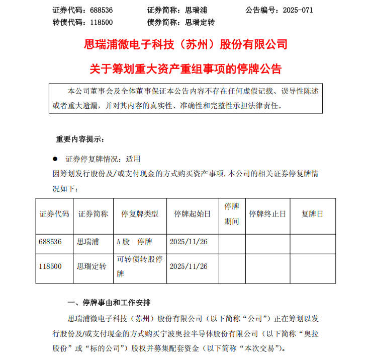 重大资产重组!思瑞浦筹划购买奥拉股份股权 股票今起停牌