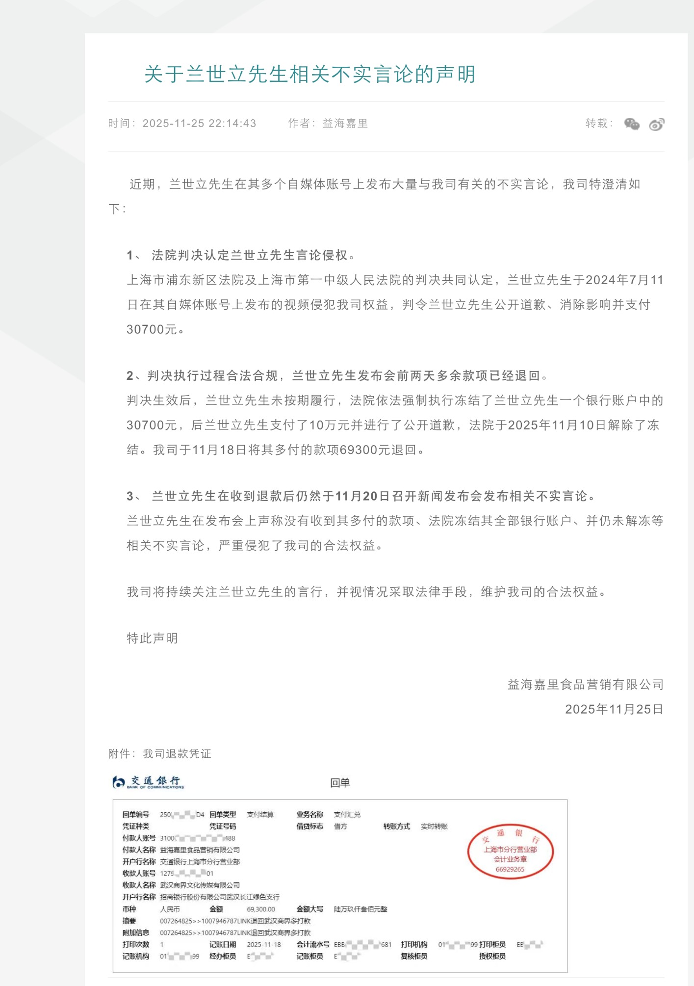 全新妙想投研助理,立即体验 11月25日晚,益海嘉里食品营销有限公司通过金龙鱼官方网站发布声明称,上海市浦东新区法院及上海市第一中级人民法院的判决共同认定,兰世立于2024年7月11日在其自媒体账号上发布的视频侵犯公司权益,判令兰世立公开道歉、消除影响并支付30700元。判决生效后,兰世立未按期履行,法院依法强制执行冻结了兰世立一个银行账户中的30700元,后兰世立支付了10万元并进行了公开道歉,法院于2025年11月10日解除了冻结。公司于11月18日将其多付的款项69300元退回。 ![]() 益海嘉里食品营销有限公司为金龙鱼(300999.SZ)全资子公司。该公司在声明中称,兰世立在收到退款后仍然于11月20日召开新闻发布会发布相关不实言论。兰世立在发布会上声称没有收到其多付的款项、法院冻结其全部银行账户、并仍未解冻等相关不实言论,严重侵犯了公司的合法权益。公司将持续关注兰世立的言行,并视情况采取法律手段,维护公司的合法权益。 湖北前首富兰世立在近日发布的道歉声明中写道:2024年7月11日,通过今日头条及抖音账号“兰世立”发布视频,标题为《武汉用油罐车运食油的事太离谱了!》,并在视频中发表了“金龙鱼两天之内跌了6500亿”“运油以后连清洗都不清洗”“金龙鱼第一个就该退市”等不实言论,构成对益海嘉里食品营销有限公司名誉权的侵犯。 2024年7月,有媒体曝光罐车混装运输食用油,引发广泛关注。彼时,金龙鱼发布官方声明,强调集团对散装食用油运输有严格监管,运输车辆均经过严格查验、检验手续。 (文章来源:界面新闻) |