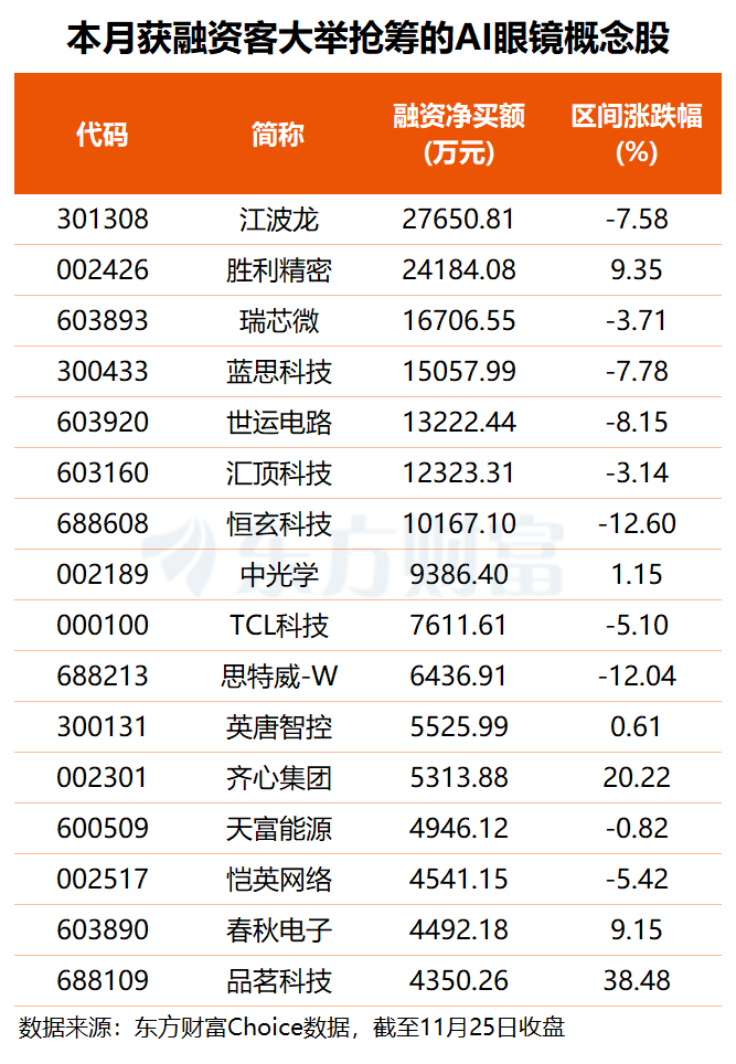 巨头争相入局机构看好未来前景 近年来,众多玩家密集涌入AI眼镜赛道。 海外方面,Meta、苹果、三星等已相继推出AI眼镜相关产品;在国内,不仅有华为、小米等传统硬件厂商,阿里、百度等互联网大厂纷纷下场,雷鸟、Rokid等深耕XR领域的企业,以及影目科技等垂类公司也频出新品,形成了全球范围内的产品迭代浪潮。 随着大厂陆续进入,带动全产业链加速发展。数据显示,仅今年上半年,全球智能眼镜出货量达406.5万台,同比增长64.2%,其中,中国厂商出货量突破100万台,占全球24.6%的市场份额。 IDC指出,2025年,智能眼镜在硬件轻量化和在基础AI功能上持续突破,为体验升级和产品功能创新奠定基础;2026年,全球智能眼镜市场出货量预计将突破2368.7万台,其中,中国智能眼镜市场出货量将突破491.5万台,市场正式迈入规模化增长新阶段。 东北证券表示,智能眼镜放量在即,传统视光企业有望进入智能眼镜供应链,打造第二增长曲线。 东方财富证券研报指出,端侧AI与Agent的结合进一步释放多场景价值,预计可以带动更大的市场规模,助力AI眼镜成为消费电子下一个创新高地。建议关注国产AI眼镜相关厂商在国产化替代趋势下的投资机会,主要包括AI眼镜和眼镜镜片等方向。 杠杆资金月内抢筹多只概念股 东方财富概念板块显示,目前A股市场共有118只AI眼镜概念股,合计总市值达2.74万亿元。其中,立讯精密体量第一,总市值达4056亿元;蓝思科技、兆易创新、鹏鼎控股、江波龙、歌尔股份等5股总市值均超千亿。 超七成AI眼镜概念股年内股价实现上涨,平均涨幅约32.14%。其中,品茗科技累涨655%居首,弘景光电、江波龙、芯原股份、统联精密、长盈精密等8股年内股价亦大涨,涨幅均在一倍至两倍之间。 品茗科技是工程建设信息化“小巨人”,公司此前在互动平台上表示,“小茗AI智能眼镜”是公司智慧工地解决方案中的一款工地现场巡检产品,该产品以AR眼镜为载体,搭载公司自研AI算法,具备违规识别、规范查询、远程指导等功能。 弘景光电深耕光学镜头及摄像模组领域,并践行“3+N”产品战略,公司近日在调研活动中表示,公司产品可应用于AI眼镜,目前部分研发项目已进入产品验证阶段,部分项目初步实现落地。 ![]() 东方财富Choice数据显示,11月以来,共有33只AI眼镜概念股获杠杆资金加仓。其中,12股融资净买额超5000万元,江波龙、胜利精密分别获融资客抢筹2.77亿和2.42亿元,瑞芯微、蓝思科技、世运电路、汇顶科技、恒玄科技均获杠杆资金逾1亿元加仓,中光学、TCL科技、思特威-W等榜上有名。 江波龙系全矩阵存储行业龙头,公司此前在定期报告中透露,公司超小尺寸eMMC及ePoP精准匹配AI穿戴设备对存储小型化与高性能的双重需求,目前已应用于阿里、XREAL、小天才、佳明(Garmin)等国际国内一线厂商的智能眼镜、智能手表当中,助力公司抢占智能穿戴领域的AI增量市场。 蓝思科技为北美头部客户的AI眼镜提供了精密结构件、光学部件、声学模组等核心部件,后续将开展软板SMT、无线充电模组、充电盒组装及整机组装。信达证券研报指出,蓝思科技系AI端侧核心个股,看好公司在该领域的发展前景。 ![]() (文章来源:东方财富研究中心) |