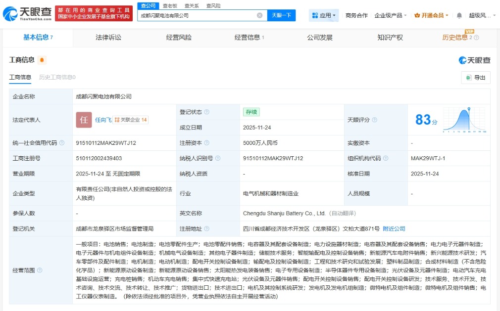 天眼查App显示,近日,成都闪聚电池有限公司成立,法定代表人为任向飞,注册资本5000万人民币,经营范围包括电池销售、电池制造、电池零配件生产、电池零配件销售等。股东信息显示,该公司由浙江吉利汽车零部件产业有限公司全资持股。