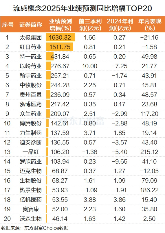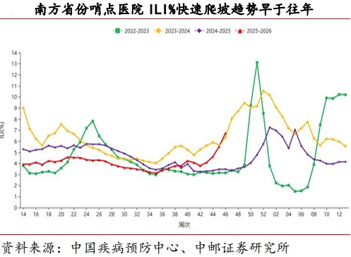 11月26日早盘流感概念继续强势,广济药业(3连板)、海南海药(2连板)、北大医药(2连板)、粤万年青纷纷涨停;康芝药业、新华制药、ST香雪、华兰疫苗等也涨幅靠前。 流感样病例提前“爬坡” 消息面上,中国疾病预防控制中心监测数据显示,全国的流感活动进入较快上升阶段,预计未来还将进一步上升。 国家流感中心公布的最新数据显示,2025年第46周北方省份哨点医院报告的ILI%(流感样病例百分比)为7.0%,高于前一周水平(6.2%),高于2022年、2023 年和2024年同期水平(2.1%、5.8%和3.9%)。 ![]() 南方省份哨点医院2025年第46周报告的ILI%为6.7%,高于前一周水平(5.5%),高于2022年、2023年和2024年同期水平(3.1%、6.4%和3.5%)。 ![]() 据上海证券报报道,电商平台数据显示流感相关药品需求激增。阿里健康近两周(11.10~11.23)流感应季药品购买量明显提升,其中玛巴洛沙韦购买人数环比增长超600%;京东买药11月17日~11月23日数据显示,奥司他韦销量环比此前7天增长4.5倍,速福达增长5倍,流感检测试剂增长4.8倍,止咳化痰与解热镇痛类药物增长超3倍。 上市公司积极“抗流感” 在当下流感高发季,不少上市公司也在互动平台上表达了公司“抗流感”的相关信息。比如珍宝岛表示,公司针对甲型、乙型流感的治疗药物有注射用炎琥宁、复方芩兰口服液、小儿热速清糖浆、双黄连口服液、双黄连注射液和注射用双黄连等,均为在产在售产品。 步长制药称,公司控股子公司天元生物已有三价流感病毒裂解疫苗——御感宁在市场销售。四价流感病毒裂解疫苗已在10月份获得《生物制品批签发证明》可以上市销售。 特一药业称,针对流感相应症状,公司有丰富的产品线,涵盖止咳、退热、抗生素、抗病毒及消化系统用药等多个类别,可全面满足对症治疗需求。 海正药业、济川药业、华兰疫苗、众生药业近期也在投资者互动平台上针对“抗流感”相关产品进行了回复。 业绩预测高增长TOP20 往后看,从机构的业绩预测来看,东方财富Choice数据显示,太极集团预计2025年归母净利润同比增长1630.32%。红日药业紧随其后,预计2025年业绩同比增长1511.75%。特一药业、以岭药业、翰宇药业等2025年业绩预测增幅也排名靠前。 从股价表现来看,2025年业绩预测增幅前20个股中,截至11月25日收盘,一品红、热景生物、众生药业纷纷翻倍,涨幅为215.12%、186.22%和117.2%。特一药业、翰宇药业、贵州百灵、博腾股份、迪安诊断、生物股份等也涨幅靠前。 ![]() 光大证券表示,近期流感疫情上升态势明显,可能引发社会公众和市场关注度的提升,从而带动防治和检测流感产品的需求增长。建议关注流感疫苗、病毒检测、感冒药与特效药等方面的投资机会,此外也建议关注血制品等应对复杂态势的防疫手段。 湘财证券研报称,近期流感活动度持续攀升,当前已攀升至2022年以来同期高位,流感用药需求增加,关注流感高发带来的呼吸系统用药需求增长。 渤海证券研报数据显示,近期国内进入流感高发期,北方流感样病例占比达近4年新高,高于2022~2024年同期水平,建议关注体外诊断、疫苗、药店及相关制药企业的阶段性投资机遇。 (文章来源:东方财富研究中心) |