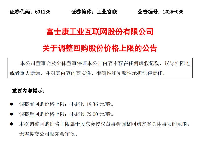 工业富联11月26日公告,鉴于公司股票价格上涨造成回购股份价格上限低于公司二级市场股价,基于对公司未来持续稳定发展的信心和对公司价值的认可,同时为了保障本次回购股份方案的顺利实施,公司将回购股份价格上限调整为不超过人民币75.00元/股,该价格不高于董事会审议通过《关于调整回购股份价格上限的议案》决议前30个交易日公司股票交易均价的150%。本次除调整回购股份价格上限外,公司以集中竞价交易方式回购公司股份的其他事项均无变化。