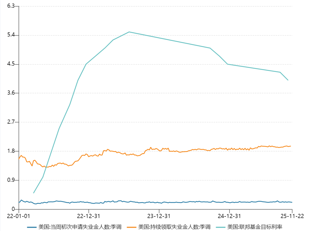 在美联储议息会议前发布的任何经济数据都在引发市场的关注。今日美国发布的周度初请失业金人数下降,表明就业情况并未恶化。虽然机构普遍预期,美联储12月降息的概率非常大,但也有机构认为,美联储仍有机会暂停降息。 失业数据好于预期 美国劳工部周三公布的数据显示,截至11月22日当周,初请失业金人数经季节调整后减少6000人,至21.6万人。经济学家此前预计,上周初请失业金人数为22.5万人。 ![]() 美国初请失业金人数(百万人)、续请失业金人数(百万人)和基准利率走势 初请失业金是美国衡量劳动力市场状况的核心指标,特指统计周期内首次申请失业保险救济金的人数,由美国劳工部每周四定期发布。该指标通过追踪新失业者申领救济的动态,直接反映企业裁员趋势和就业市场短期波动,被视为经济周期的先行指标。由于本周四是感恩节假期,该报告提前一天发布。 此外,续请失业金人数(衡量正在领取失业金人数的指标)则在前一周微升至196万人。自9月以来,续请失业金人数总体呈上升趋势,目前仍接近疫情后劳动力市场复苏时期的水平。 分析认为,特朗普激进的贸易和移民政策创造了一个企业不愿裁员或雇佣更多工人的环境,导致了他们和政策制定者所说的“不雇不炒”的劳动力市场。但由于人工智能的盛行,包括亚马逊在内的大型企业正在加大裁员力度。经济学家预计,这些裁员可能会体现在明年的初请失业金数据中,不过过去申请失业金的人数并不总是随着宣布裁员而增加。 美联储降息概率提高 德国商业银行报告指出,周三公布的美国周度初请失业金数据因其他劳动力市场数据缺失而获得额外关注。但由于市场已基本消化12月降息预期,该数据不太可能引发美元大幅波动。 事实上,近期的就业数据没有恶化迹象。但市场普遍认为美联储12月降息的概率极大。芝加哥市场交易所美联储观察(FedWatch)工具显示,市场预计美联储有近85%的概率会降幅2.5个百分点。 高盛最新预计,美联储将在12月的会议上实施连续第三次降息。该行认为,通胀放缓以及劳动力市场降温,为政策制定者进一步放松货币政策提供了空间。“明年的风险倾向于进行更多次降息,因为核心通胀方面的消息一直有利,而就业市场的恶化可能难以通过我们预期的温和的周期性增长加速来遏制。”高盛还预计,美联储2026年将再降息两次,分别在3月和6月,最终将联邦基金利率降至3.00%—3.25%的区间。 但也有机构认为,美联储降息并非板上钉钉。 摩根大通就认为,美联储下月会议的决策“极为接近”,比去年9月的情况更难判断。此前的经济数据为鹰派和鸽派都提供了充足的辩论材料,无论最终决定如何都可能出现多位委员投反对票。 该行认为,美联储主席鲍威尔和会议纪要此前已暗示委员会希望放缓降息节奏,9月就业报告为暂停降息提供了理由。但摩根大通也提醒,可能低估了决策中的政治因素,且判断可能过度依赖鹰派非投票委员的言论。 摩根大通称,按照修正后的预测路径,美联储将在12月暂停降息,随后在明年1月和5月分别降息,然后进入观望期。