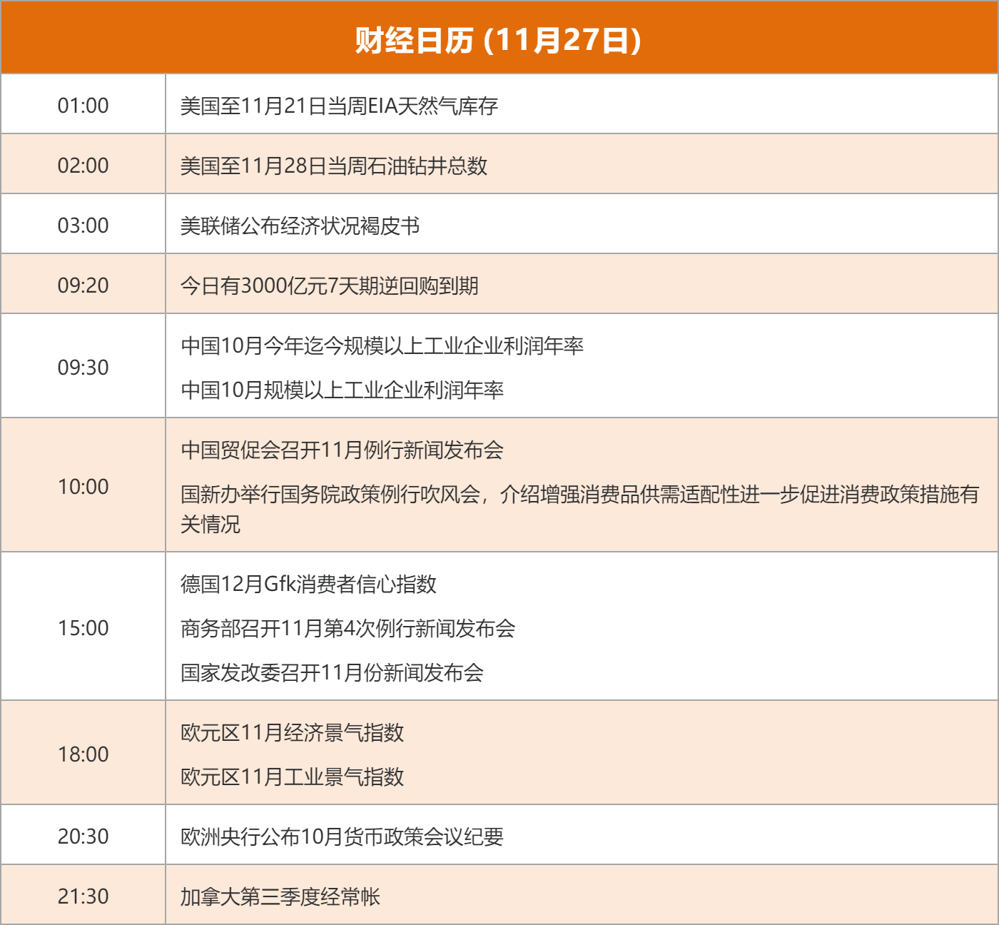 公司新闻中际旭创:针对中际旭创是谷歌光模块供应商的市场传闻。有记者以投资者身份致电中际旭创,接线人员表示,公司本次股价上涨受综合因素影响,至于公司的“具体合作包括订单都不方便透露”。 小米:前特斯拉Optimus(“擎天柱”)灵巧手团队成员卢泽宇正式入职小米,担任小米机器人灵巧手负责人。 品茗科技:如公司股票交易持续异常波动,可能出现以下情况:公司可能按照相关规则要求申请停牌核查,公司股票可能被上海证券交易所重点监控,异常交易相关投资者账户可能被暂停交易等。 实达集团:公司注意到网络平台上有关本公司与阿里云合作的传闻,目前公司与阿里云之间未开展业务合作。 金迪克:截至本公告披露日,公司本年度生产季已经结束,取得批签发证明的四价流感病毒裂解疫苗共约156万支,本年度内不会新增四价流感病毒裂解疫苗批签发。 广联达:公司CONCETTO智能设计产品聚焦于建筑项目前期策划与方案设计阶段,以“AI+数智化”双轮驱动,重塑设计全流程。产品能力覆盖数智化建模、AI灵感渲染器、AI成本估算、AI分析等核心模块,当前已经接入Nano Banana Pro(谷歌麾下的图像生成模型)。 东威科技:今年PCB电镀设备订单增长的主要是得益于PCB东南亚投资潮、AI智能相关的大数据存储器等领域快速发展带来的新机遇,PCB领域高端板材需求增加,相关电路板层数及厚度增加,公司电镀设备订单增幅较大,尤其是脉冲电镀设备订单增幅明显。预计今年公司订单金额将创历史新高。 奕东电子:公司拟使用6120万元对深圳市冠鼎金属科技有限公司进行投资,取得其51%股权。此次投资与增资旨在进一步布局AI服务器液冷散热等领域产品和业务。 长光华芯:近期算力需求增长,在光通信领域中,公司的100G EML已实现量产,200G EML已开始送样,100G VCSEL、100mW CW DFB和70mW CWDM4 DFB芯片已达到量产出货水平。 天山铝业:公司140万吨电解铝绿色低碳能效提升改造项目首批电解槽正式开始通电启槽。项目完工后,公司电解铝产量将提升至合规批复产能140万吨/年,铝液综合交流电耗将达到行业领先水平。 >">>">点击查看更多上市公司重大公告>> 环球市场 美联储褐皮书: 美联储表示,近几周美国经济活动总体变化不大,整体消费者支出进一步下降,只有高端消费者的支出依然坚挺。美联储在周三(11月26日)发布的《褐皮书》中写道,“整体前景基本未变。一些受访者指出,未来几个月经济活动放缓的风险上升,但制造业方面出现了一些乐观情绪。” 摩根大通看涨标普或突破8000点: 在本周发布的《2026全球股票展望》中,摩根大通全球市场策略主管杜布拉夫科·拉科斯-布亚什(Dubravko Lakos-Bujas)领导的团队放弃了对美股市场相对谨慎的立场,将2026年标普500指数的基准预期上调至7500点,并表示若美联储宽松超预期,标普明年还有机会摸一下8000点。 交易提示![]() 点击立即参与申购>> 债市纵览Shibor:11月26日,隔夜shibor报1.3160%,与前一交易日持平。7天shibor报1.4530%,上涨2.00个基点;14天shibor报1.5070%,下跌3.30个基点;1月shibor报1.5190%,下跌0.10个基点;3月shibor报1.5790%,下跌0.10个基点。 欧债:欧市尾盘,英国10年期国债收益率跌7.1个基点,报4.423%。两年期英债收益率跌2.7个基点,报3.738%。30年期英债收益率跌11.7个基点,5.205%。50年期英债收益率跌10.5个基点,报4.679%。2/10年期英债收益率利差跌4.261个基点,报+68.386个基点。德国10年期国债收益率跌0.1个基点,报2.671%。两年期德债收益率涨0.2个基点,报2.018%;30年期德债收益率涨0.7个基点,报3.307%。2/10年期德债收益率利差跌0.354个基点,报+65.109个基点。法国10年期国债收益率跌1.1个基点,报3.396%。意大利10年期国债收益率跌1.0个基点,报3.391%。西班牙10年期国债收益率跌1.1个基点,报3.152%。希腊10年期国债收益率涨0.1个基点,报3.277%。 美债:纽约尾盘,美国10年期国债收益率跌0.19个基点,报3.9941%。两年期美债收益率涨2.04个基点,报3.4791%。2/10年期美债收益率利差跌2.033个基点,报+51.501个基点。10年期通胀保值国债(TIPS)收益率跌0.97个基点,至1.7352%;两年期TIPS收益率跌0.59个基点,至1.0397%;30年期TIPS收益率跌1.56个基点,至2.4437%。 商品期货国内期货:11月26日,国内商品期货收盘涨跌不一,花生涨4%,多晶硅涨近3%,玻璃、碳酸锂、沪银、生猪、液化气、苯乙烯、尿素、苹果涨超1%;跌幅方面,集运欧线跌超7%,聚丙烯、焦炭、塑料、焦煤跌超1%。 国际金价:COMEX黄金期货当月连续合约上涨18.80美元,涨幅0.45%,报4196.1美元/盎司。 国际油价:国际油价11月26日上涨。截至当天收盘,纽约商品交易所WTI原油期货当月连续合约上涨0.60美元,收于每桶58.55美元,涨幅为1.04%。 国际金属:LME期铜收涨157美元,报10975美元/吨。LME期铝收涨60美元,报2861美元/吨。LME期锌收涨64美元,报3056美元/吨。LME期铅收跌1美元,报1980美元/吨。LME期镍收跌49美元,报14823美元/吨。LME期锡收涨444美元,报37991美元/吨。LME期钴收平,报48570美元/吨。 国际农产品:纽约尾盘,彭博谷物分类指数涨0.83%,报30.4050点,北京时间22:30美股开盘之后出现一波短线拉涨行情。CBOT玉米期货涨1.83%,报4.4625美元/蒲式耳。CBOT小麦期货涨0.37%,报5.41美元/蒲式耳。CBOT大豆期货涨0.64%,报11.3225美元/蒲式耳,豆粕期货涨0.09%,豆油期货涨0.89%。CBOT瘦肉猪期货涨3.39%,活牛期货涨2.21%,饲牛期货涨2.71%。 外汇市场人民币:11月26日,在岸人民币北京时间16:30收报7.08020,较上一交易日