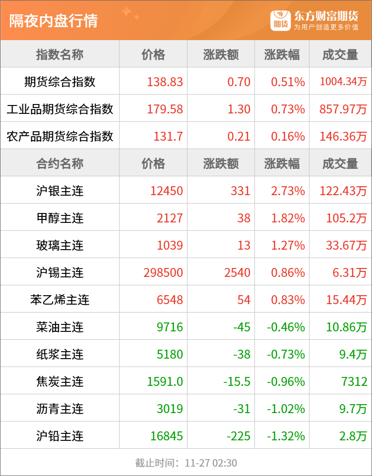 隔夜行情![]() ![]() 每日精选广期所发布铂、钯期货合约挂牌基准价 印尼国有化进程加速 棕榈油价格底部或抬升 生猪屠宰毛利同比增长超3倍:达到近五年高位 头部企业加速扩产 宏观产经工信部网站:工业和信息化部等六部门印发《关于增强消费品供需适配性进一步促进消费的实施方案》。方案指出,到2027年,消费品供给结构明显优化,形成3个万亿级消费领域和10个千亿级消费热点,打造一批富有文化内涵、享誉全球的高品质消费品。到2030年,供给与消费良性互动、相互促进的高质量发展格局基本形成,消费对经济增长的贡献率稳步提升。 澎湃新闻:有记者提问称,11月25日,针对日本政府对“存亡危机”的认定标准是否维持不变,日本政府内阁决议通过答辩书,称日本首相高市早苗的国会答辩不改变日本政府的一贯立场,强调政府将根据事态的具体情况综合判断所有信息,政府立场完全维持不变,没有修订和再研究的必要。外交部发言人毛宁对此表示,日方言论违背中日四个政治文件精神,破坏中日关系政治基础,中方坚决反对。毛宁敦促日方认真对待中方要求,反思纠错、收回错误言论,并要求日方诚实、准确、完整地讲清其所谓“一贯立场”。 商务部网站:11月26日,商务部部长王文涛与欧盟委员会贸易和经济安全委员谢夫乔维奇举行视频会谈,就安世半导体等经贸问题深入交换意见。王文涛表示,关于安世半导体问题,造成当前全球半导体产供链混乱的源头和责任在荷兰方面。中国政府始终本着负责任的态度,及时采取切实措施,努力维护和恢复全球半导体产供链稳定。 品种资讯钢材:11月中旬,重点统计钢铁企业共生产粗钢1943万吨,平均日产194.3万吨,日产环比增长0.9%;生铁1797万吨,平均日产179.7万吨,日产环比下降0.4%;钢材1924万吨,平均日产192.4万吨,日产环比增长2.1%。据此估算,本旬全国日产粗钢231万吨、环比下降1.8%,日产生铁211万吨、环比下降0.2%,日产钢材397万吨、环比增长1.1%。(中钢协) 焦煤:11月26日吕梁离石市场炼焦煤进行线上竞拍。低硫主焦煤A11、S0.6、G90起拍价1500元/吨,成交均价1502元/吨,上期11月25日起拍价1500流拍;高硫瘦煤A10.5、S1.85、G72起拍价1200元/吨,本期全流拍,上期11月25日起拍价1200流拍。 11月26日临汾市场炼焦煤竞拍价格全面下跌。截止目前统计到9家成交结果,累计挂牌24万吨,流拍率约62%,平均跌幅53元/吨。其中高硫主焦A11、S3.7、G92成交均价1441元/吨跌79元/吨,低硫瘦煤A10、S0.6、G58成交价1230元/吨跌50元/吨,低硫主焦 A10.5、S0.5、G80起拍价1580元/吨全部流拍,短期价格震荡偏弱运行。(我的钢铁网) 农产品期货 生猪:据农业农村部监测,截至11月26日14:00时,全国农产品批发市场猪肉平均价格为17.87元/公斤,较前一日上升0.8%;鸡蛋平均价格为7.27元/公斤,较前一日下降1.1%。 农业农村部发布农产品供需形势分析月报,四季度生猪出栏节奏趋于平稳,入冬后居民家庭腌腊、灌肠等需求增长,猪肉消费进入旺季,猪肉进口量继续保持低位,供需形势改善将带动猪价温和反弹。预计春节前猪价将季节性温和回升。(农业农村部) 棕榈油:南部半岛棕榈油压榨商协会(SPPOMA)数据显示,2025年11月1日-25日马来西亚棕榈油单产环比前一月同期增加3.34%,出油率环比前一月同期增加0.41%,产量环比前一月同期增加5.49%。(新华财经) 鸡蛋:11月26日鸡蛋价格趋于稳定,主产区山东鸡蛋均价5.95元/公斤,较昨日价格上涨0.06;河北鸡蛋均价5.61元/公斤,与昨日价格持平;广东鸡蛋均价6.73元/公斤,与昨日价格持平;北京鸡蛋均价6.16元/公斤,与昨日价格持平。(中国饲料行业信息网) 有色/贵金属期货 沪铝:据悉,力勤在印尼的电解铝项目(PT Kalimantan Aluminium Industry)一期50万吨产能已于近日完成投产,将于2026年10月实现一期满产。(上海有色网) 天山铝业11月26日公告,公司140万吨电解铝绿色低碳能效提升改造项目首批电解槽正式开始通电启槽。项目完工后,公司电解铝产量将提升至合规批复产能140万吨/年,铝液综合交流电耗将达到行业领先水平。(人民财讯) 工业硅:11月26日,华东不通氧553#在9300-9400元/吨;通氧553#在9400-9600元/吨;521#在9600-9700元/吨;441#在9600-9800元/吨;421#在9600-9900元/吨;421#有机硅用在9800-10200元/吨;3303#在10300-10600元/吨。昆明、黄埔港、天津、西北、新疆、四川、上海地区硅价持稳。97硅今日价格同样持稳。(上海有色网) 多晶硅:据安泰科统计,本周多晶硅n型复投料成交价格区间为4.9-5.5万元/吨,成交均价为5.32万元/吨,环比持平。n型颗粒硅成交价格区间为5.0-5.1万元/吨,成交均价为5.05万元/吨,环比持平。市场价格在弱势中能够保持稳定的主要原因来自供需两侧的共同支撑。供应端,硅料企业稳价意愿坚决。本月两家头部企业执行了较大幅度的减产降负荷计划,市场延续了供应收缩的态势。(中国有色金属工业协会硅业分会) 能化期货 原油:高盛集团石油研究主管Daan Struyven称,如果乌克兰和俄罗斯达成和平协议,可能会使该机构的基本油价预测下调约5美元/桶。高盛对明年布伦特原油价格的基本预测目前为每桶56美元,“如果美方制裁有可能解除的话,我们预计油价将比该预测值再低约5美元,即2026年布伦特油价略高于每桶50美元”。石油市场供应过剩的状况将延续到2026年,然后在2027年恢复平衡。(财联社) 尿素:11月26日山东地区尿素价格部分下调,小颗粒主流出厂成交1570-1640元/吨,大颗粒出厂成交184