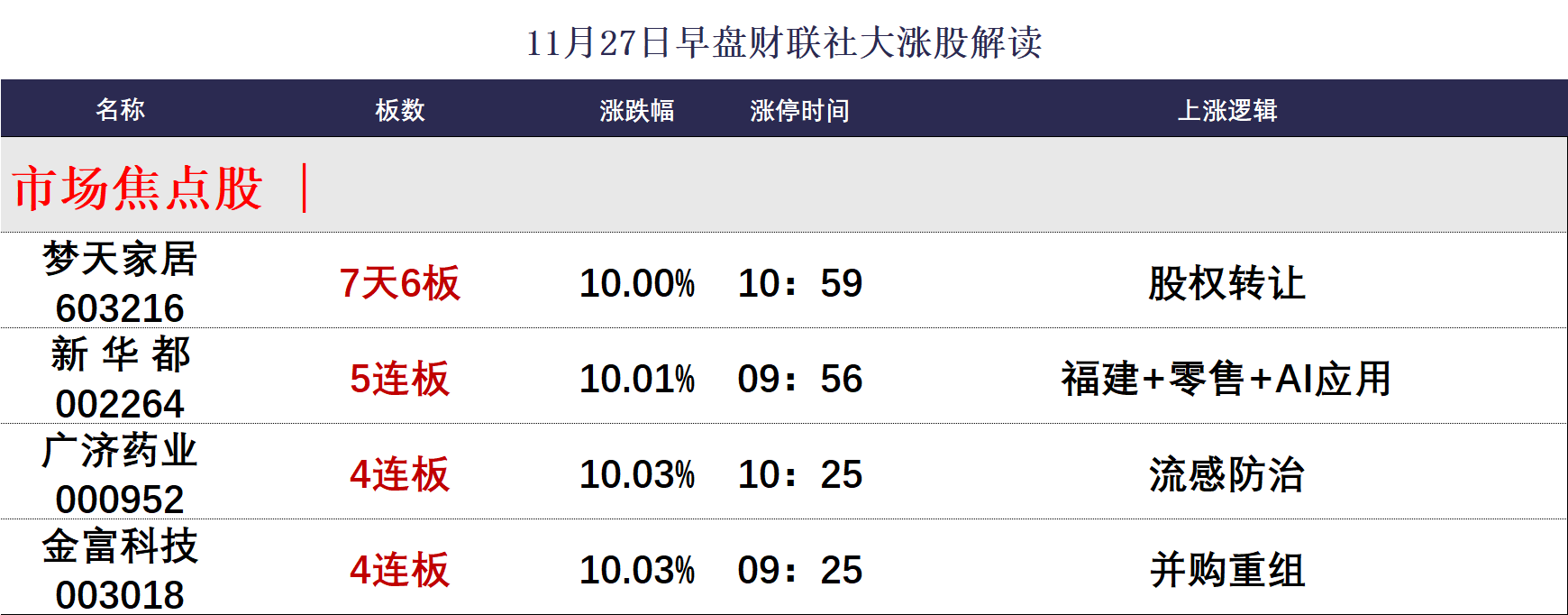 今日午盘全市场共42股涨停,连板股总数10只,24股封板未遂,封板率为64%(不含ST股、退市股)。焦点股方面,梦天家居反包涨停走出7天6板,福建零售股新华都5连板,流感防治概念股广济药业4连板,并购重组的金富科技一字涨停晋级4连板。
