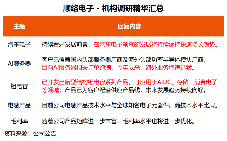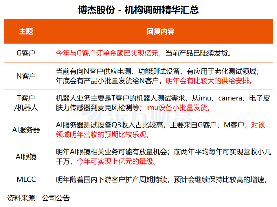 AI浪潮下全球算力需求旺盛,AI服务器行业呈现高速增长态势,上市公司围绕产业链的相关布局也受到市场关注。 11月27日,博杰股份(002975)和顺络电子(002138)披露投资者关系活动记录表,两家公司都谈及了各自AI服务器相关业务的最新进展。 其中,博杰股份在接受中信建投、中南资本等9家机构调研时表示,公司第三季度营收中,AI服务器测试设备收入占比较高,公司对该领域明年营收的预期比较乐观。 与大客户的合作方面,据公司介绍,今年与G客户的订单金额已实现亿元;年底会有产品小批量发货给N客户,明年会有比较大的供给安排;当前机器人业务主要是T客户的机器人测试需求,imu设备小批量发货,单台价格上百万。 对于明年的业务预期,博杰股份在调研中也透露了重要信息:汽车电子业务方面,公司预计明年市场需求仍会持续放量;消费电子业务预计今年营收占比40%左右,明年AI眼镜相关业务可能有放量机会,今年可实现上亿元的量级;在MLCC领域,预计会继续保持比较高的增速;机器人业务取决于客户生产节奏,未来会深入研究进行战略布局。 ![]() 顺络电子在接受中泰证券、宝盈基金等13家机构调研时表示,公司为各类AI服务器类客户提供一站式元器件解决方案,客户已覆盖国内头部服务器厂商及海外头部功率半导体模块厂商;目前公司AI服务器相关的订单饱满,相关业务快速增长(今年来,海外业务增速迅猛)。 关于钽电容产品,顺络电子称,公司已开发出全新工艺的新型结构钽电容系列产品,可广泛应用于通讯、消费电子、AI数据中心、汽车电子、工控等领域。目前钽电容产品已为客户配套供应产品线,未来发展趋势持续向好。 ![]() 资料显示,博杰股份业务覆盖设备的研发、生产、销售及相关技术服务,旨在帮助客户提高生产效率和产品良品率。公司今年前三季度实现营收11.17亿元,同比增长35.61%;归母净利润为1.06亿元,同比大幅增长6760.54%。 华安证券此前研报指出,AI算力资本开支有望进入上行期,随着客户产品设计复杂度及功率的提升,其对测试产品的技术要求会很高,公司作为该领域技术水平上的垂类领军企业,有望受益于客户产品更新迭代带来的业务增长。 顺络电子主要从事研发、设计、生产、销售新型精密电子元器件。今年前三季度,公司实现营收50.32亿元,同比增长19.95%;归母净利润为7.69亿元,同比增长23.23%。 山西证券表示,国产算力大模型快速应用,公司国产算力业务逐季蓬勃发展;海外重量级客户对ASIC芯片、CPU、GPU周边的xPU供电环节各类模块化电感方案快速增长的需求,为公司数据中心市场持续增长奠定了另一块基石。此外,公司SOFC项目按照规划稳步推进,未来值得期待。 二级市场方面,博杰股份今日上涨7.75%,总市值133亿元;顺络电子股价收跌1.50%,月内股价较高点已回撤约12%。