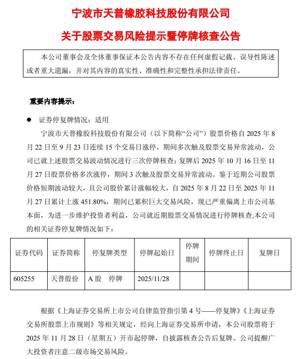 天普股份(605255.SH)公告称,公司股票价格自2025年8月22日至9月23日连续15个交易日涨停,期间多次触及股票交易异常波动。为维护投资者利益,公司申请股票于2025年11月28日开市起停牌,自披露核查公告后复牌。公司提醒广大投资者注意二级市场交易风险。