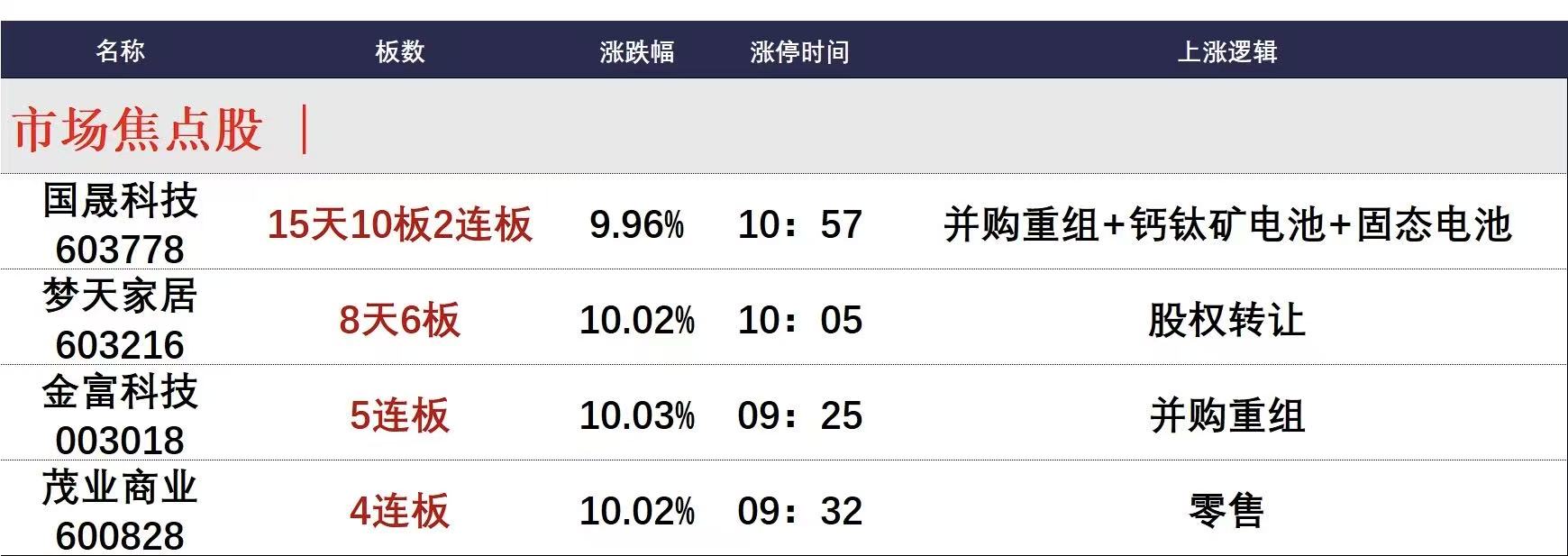 今日午盘全市场共51股涨停,连板股总数8只,20股封板未遂,封板率为72%(不含ST股、退市股)。焦点股方面,并购重组的国晟科技15天10板、金富科技5连板,股权转让的梦天家居8天6板,零售股茂业商业4连板。