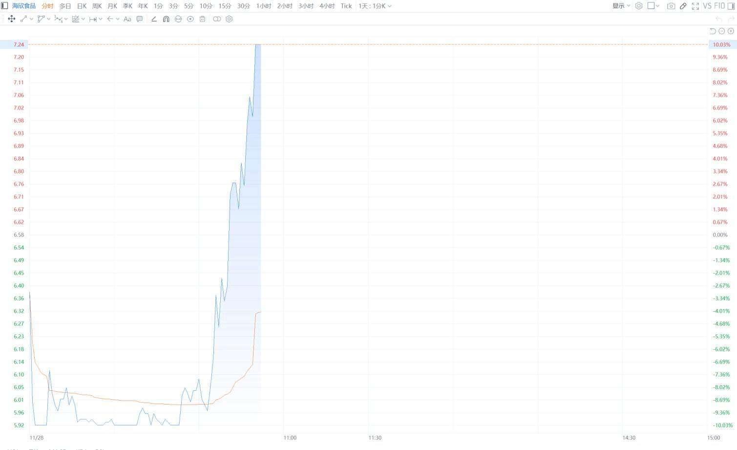 格隆汇11月28日|海欣食品(002702)午前拉升触及涨停,上演“地天板”,换手率超35%。