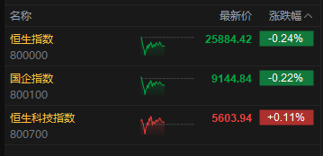11月28日消息,港股三大指数涨跌不一。截至午间收盘,恒生指数跌0.24%,报25884.42点,恒生科技指数涨0.11%,国企指数跌0.22%。盘面上,科网股跌多涨少,小米跌超0.5%,京东涨近1%;黄金股普涨,珠峰黄金涨超5%;创新药概念高开低走,药明康德(603259)跌超3%;海伟股份上市首日跌超15%。