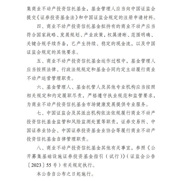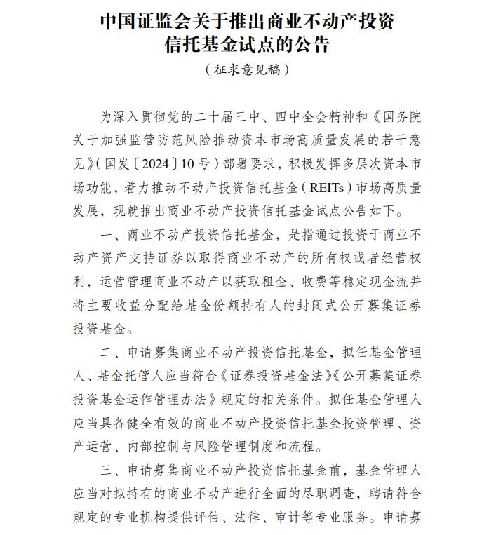 《中国证监会关于推出商业不动产投资信托基金试点的公告(征求意见稿)》公开征求意见 在丁冬财经看资讯行情,选丁冬财经证券一站式开户交易>> 为贯彻落实党中央、国务院决策部署和资本市场新“国九条”要求,推动不动产投资信托基金(REITs)市场高质量发展,丰富资本市场投融资工具,支持构建房地产发展新模式,持续增强多层次资本市场服务实体经济质效,中国证监会研究起草了《中国证监会关于推出商业不动产投资信托基金试点的公告(征求意见稿)》(简称《公告》),现向社会公开征求意见。 《公告》共八条,主要包括以下内容:一是产品定义,商业不动产REITs是指通过持有商业不动产以获取稳定现金流并向基金份额持有人分配收益的封闭式公开募集证券投资基金。二是基金注册及运营管理要求,明确基金管理人及基金托管人、尽职调查、申请材料、商业不动产等方面要求,以及基金管理人的主动运营管理责任。三是发挥基金管理人和专业机构作用,压严压实责任,要求严格遵守执业规范和监管要求。四是强化监管责任,明确各监管机构依法依规履行商业不动产REITs监管和风险监测处置等职责。此外,商业不动产REITs其他有关事宜,参照《公开募集基础设施证券投资基金指引(试行)》有关规定执行。 欢迎社会各界对《公告》提出宝贵意见,中国证监会将根据公开征求意见情况,进一步完善《公告》并履行程序后发布实施。 ![]() ![]()