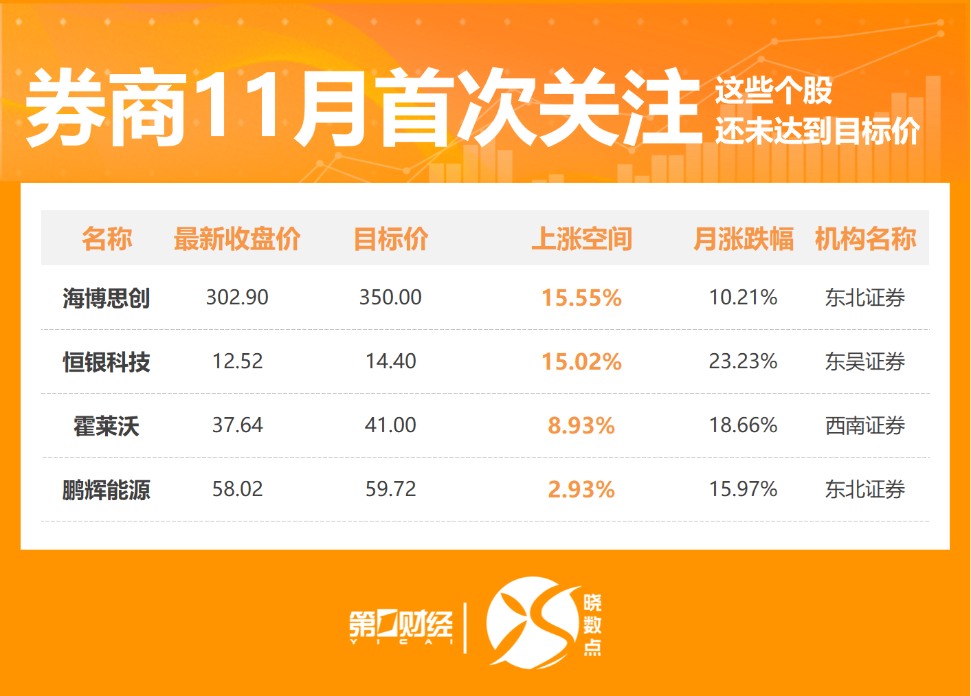 晓数点丨11月317股获券商首次关注!这只股距目标价还有15%上涨空间 专业金融数据,下一代智能终端 Wind数据显示,截至11月29日,11月内共有317只个股获券商首次关注。哪些行业最受券商青睐?这些个股11月以来的市场表现如何?哪些个股最具潜力? 这些个股表现强势 从11月的市场表现看,截至11月28日收盘,上述317只个股中有24只个股月内涨幅超过10%。其中,海科新源大涨超122%,赛微电子涨超98%,长光华芯涨超60%。 ![]() 具体来看,涨幅位居第一的是海科新源,该股11月获招商证券首次关注,给予“增持”评级。 招商证券在研报中表示,受益于下游储能等需求快速增长,添加剂、溶剂等环节供需态势明显好转,主营的锂电溶剂、添加剂价格进入上涨通道,未来可能有较大的盈利弹性。 此外,赛微电子获华福证券首次关注,给予“买入”评级;长光华芯获中邮证券首次关注,给予“买入”评级。 这只个股最具潜力 在上述月内涨幅超过10%的24只个股中,有以下4只个股尚未达到券商给出的目标价。 ![]() 海博思创的最大涨幅空间超15%,该股最新收盘价报302.9元,东北证券在11月11日发布的研报中给出了350元的目标价。 (文章来源:第一财经) |