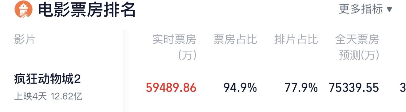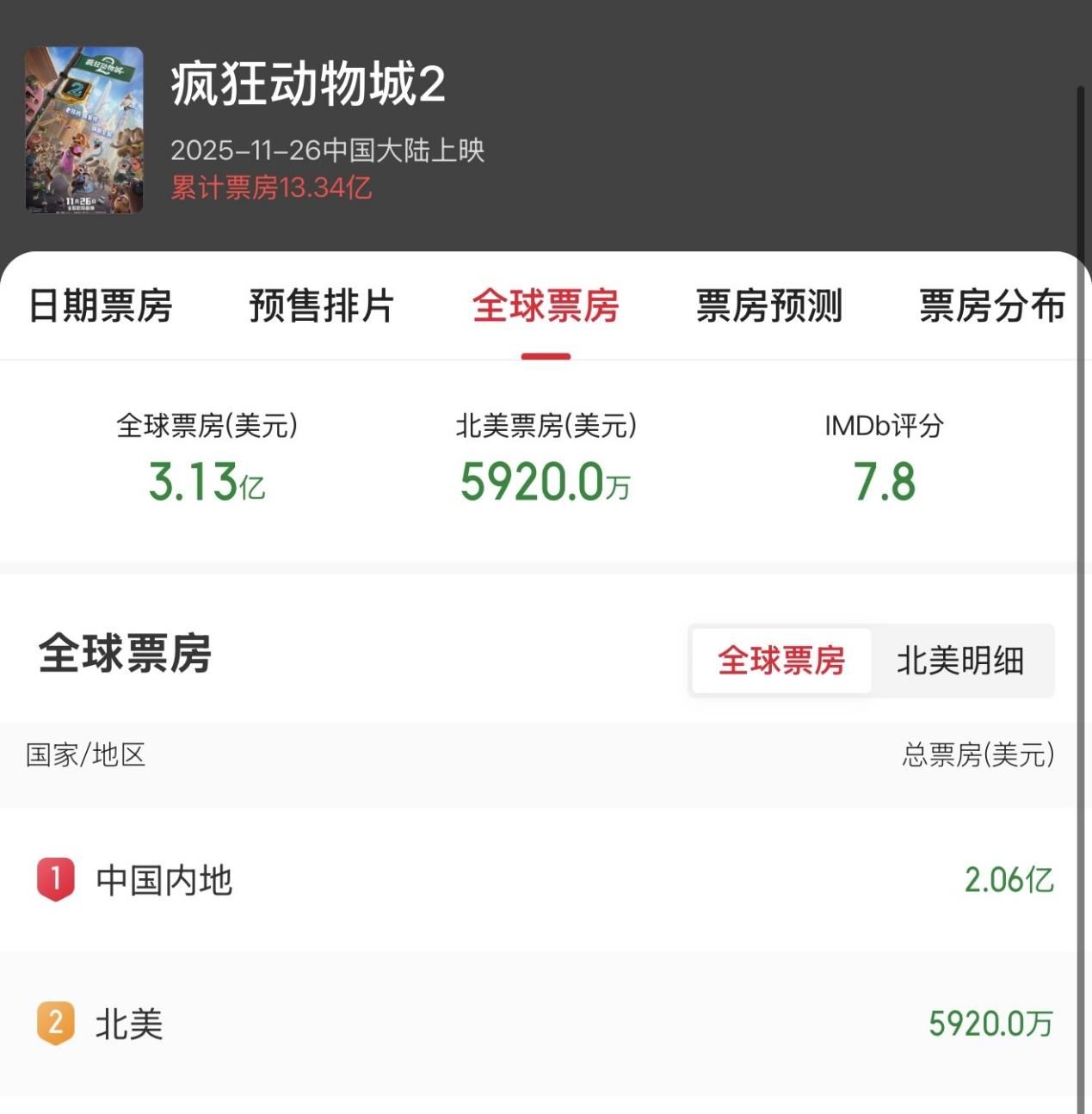 《疯狂动物城2》爆了。 这个周末,多家影院经理直观感受到,观影的热闹氛围仿佛回到了春节档。 ![]() 一些影院的黄金场次已经满座 图片来源:猫眼App截图 有的影院甚至在周日凌晨密集排了三场,最晚的一场于00:45开场,散场时已是凌晨2:33。 ![]() 11月30日的凌晨排片 图片来源:猫眼App截图 据猫眼专业版预测,11月29日,《疯狂动物城2》单日票房将超过7亿元,总票房预测上调至42.63亿元。 ![]() 图片来源:猫眼专业版 2025年国内单日票房纪录由今年春节档上映的《哪吒之魔童闹海》保持,为8.66亿元。相比之下,《疯狂动物城2》的表现已接近这一高点。 ![]() 图片来源:猫眼专业版 济南新世纪电影城经理李言鲁对《每日经济新闻》记者表示:“在这个时间段,《疯狂动物城2》没有对手。一些影厅数量较少的影院,全天只排这一部片子。” 截至11月29日晚23:00,《疯狂动物城2》累计票房已超过14亿元。照此势头,影片超越《速度与激情8》(内地票房26.7亿元)、成为国内进口片亚军已几无悬念,甚至有望挑战目前的冠军——同样来自迪士尼的《复仇者联盟4:终局之战》(票房42.5亿元)。 “如果不提前买票,这个周末只能看《疯狂动物城2》黄金场次的角落座位了。”李言鲁告诉记者。 以他管理的济南新世纪电影城(泉城路店)为例,《疯狂动物城2》上映后掀起观影热潮,影院几乎全天候排映该片,“其他影片基本也就是早晚场补一下”。他了解到,一些影厅数量较少的影院甚至全天只排《疯狂动物城2》。 据灯塔专业版数据,11月29日,《疯狂动物城2》的排片占比高达77.9%,票房占比更是达到惊人的94.9%,单日预测票房超过7.5亿元。 ![]() 图片来源:灯塔专业版 这几乎是一场碾压式的市场“盛况”。李言鲁回忆,上一次电影院出现如此“疯狂”的场面,还是春节期间《哪吒之魔童闹海》上映时。“但《哪吒之魔童闹海》那时候还有春节档其他影片分流,《疯狂动物城2》现在是完全没有对手。” “前两天工作日主要是大学生,到了周末就全是中小学生。”李言鲁观察到,本周末大量亲子家庭也涌入影院。“IP(具有商业价值的创意内容或品牌)太强大了,我家孩子昨天一放学就要去看。” 自2016年第一部《疯狂动物城》全球票房突破10亿美元以来,这一IP始终保持着跨文化的共鸣。李言鲁表示,虽然当下这波亲子观众中的很多孩子在9年前尚未出生,但他们大多早已通过家里的电视、平板,甚至在学校里看过《疯狂动物城》。“主题曲《Try Everything》一响起,孩子们都会跟着摆动。” 《疯狂动物城2》能在这样一个传统淡季点燃电影市场,也离不开过硬的口碑支撑。在豆瓣平台,尽管评分相较第一部的9.3分略有下滑,降至8.6分,但仍有不少观众称赞影片延续了前作对“偏见与包容”主题的探讨,并通过蛇盖瑞等新角色注入了新鲜血液,令全球观众、尤其是年轻群体产生强烈的情感共鸣。 目前,灯塔专业版预测《疯狂动物城2》总票房将达到40.55亿元,猫眼专业版也将其预测总票房上调至42.63亿元。 11月26日,《疯狂动物城2》在中国内地与北美同步上映。这部时隔九年推出的续作,不仅点燃了年底冷清的电影院线,更成为迪士尼在全球市场的一剂强心针。 根据迪士尼公布的2025财年第四季度及全年业绩报告,在娱乐业务板块,全年营业收入增长19%,达47亿美元;但第四季度营业收入为6.91亿美元,较2024年同期减少3.76亿美元,主要受影院上映档期同比下滑的影响。 对中国市场而言,迪士尼也亟需一部提振士气的动画电影。据灯塔专业版数据,《每日经济新闻》记者统计发现,自2020年以来,迪士尼出品的动画电影在内地票房均未突破5亿元。而在非动画领域,迪士尼旗下的二十世纪影业曾于2024年和2022年分别推出票房达7.86亿元的《异形:夺命舰》和17亿元的《阿凡达:水之道》;漫威影业则在2024年与2023年分别推出票房为4.3亿元的《死侍与金刚狼》和6.06亿元的《银河护卫队3》。 如今,凭借《疯狂动物城2》的强劲势头,其超越《速度与激情8》(内地票房26.7亿元)、成为国内进口片亚军已几无悬念,甚至有希望挑战目前的冠军——同样来自迪士尼的《复仇者联盟4:终局之战》(票房42.5亿元)。 ![]() 图片来源:猫眼专业版 在全球票仓中,中国内地市场成为“顶梁柱”。目前3.13亿美元的全球票房中,中国内地票房高达2.06亿美元,北美5920万美元。 ![]() 图片来源:猫眼专业版 《疯狂动物城2》快速出圈的背后,是迪士尼对中国市场的精准布局。影片上映前,迪士尼与上海美术电影制片厂合作推出四支宣传短片,迪士尼CEO鲍勃·艾格更亲临上海首映礼站台。 此外,名创优品、泡泡玛特、瑞幸咖啡、52TOYS等大量品牌的联名营销,进一步放大了IP效应。 《每日经济新闻》记者注意到,以泡泡玛特推出的联名产品《再续系列》为例,目前其官方小程序及线下门店均已售罄,二手平台上部分款式价格甚至出现上涨。 ![]() ![]() 图片来源:泡泡玛特官方小程序、千岛小程序 影片上映前,52TOYS先后推出“疯狂动物城棉花糖系列”“疯狂动物城最佳拍档系列”两套IP玩具,以及衍生周边“疯狂动物城萌友集结系列”手机挂绳。记者了解到,随着影片正式上映,在全国500家万达影城内的52TOYS中岛店,“疯狂动物城”系列产品已成为当仁不让的爆款。 《疯狂动物城2》与瑞幸推出联名产品,上线三天就宣告即将售罄。对此,瑞幸官方发布通知:加急补货中。 !