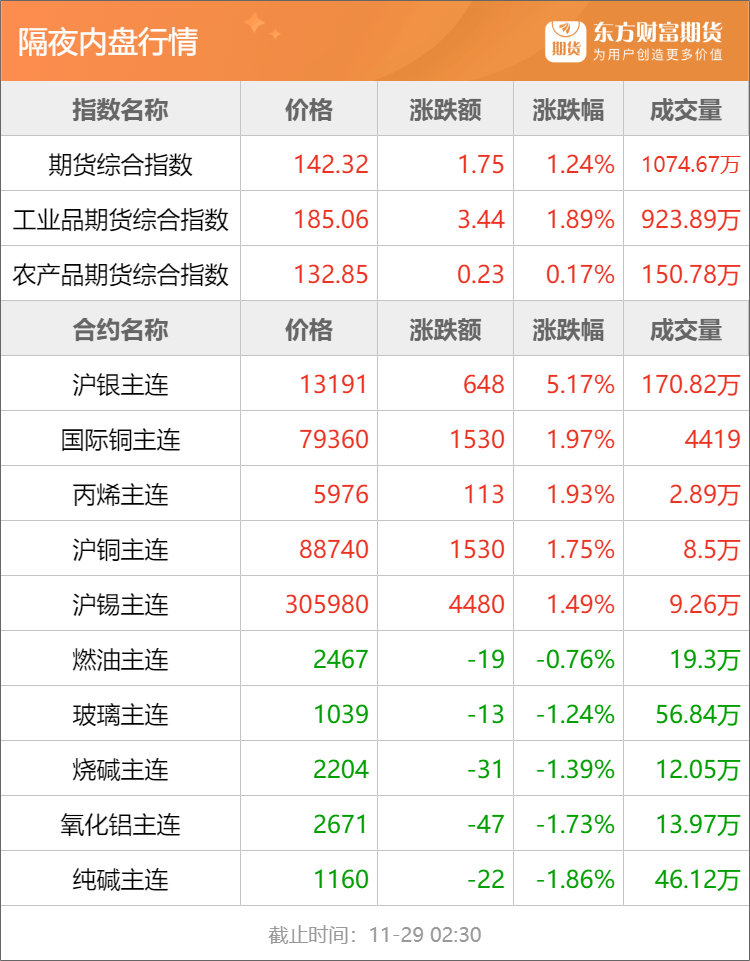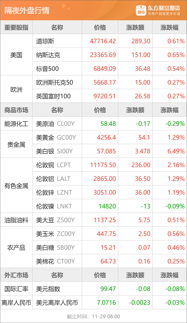 隔夜行情![]() ![]() 每日精选金价、银价突然飙涨! 碳酸锂市场核心矛盾变了吗? “铜博士”创新高!矿商“狮子大开口” 供应链警报或拉响 宏观产经国家统计局:11月份,制造业采购经理指数(PMI)为49.2%,比上月上升0.2个百分点,景气水平有所改善。11月份,非制造业商务活动指数为49.5%,比上月下降0.6个百分点。11月份,综合PMI产出指数为49.7%,比上月下降0.3个百分点。 界面新闻:为深入贯彻党的二十届四中全会精神,加快实现高水平科技自立自强,落实《加快构建科技金融体制有力支撑高水平科技自立自强的若干政策举措》,11月27日,中国人民银行、科技部等部门联合召开科技金融统筹推进机制第一次会议。中国人民银行行长潘功胜、科技部部长阴和俊出席会议并讲话。中国人民银行副行长朱鹤新主持会议,科技部副部长邱勇、金融监管总局副局长周亮、中国证监会副主席陈华平、国务院国资委党委委员肖宗辉出席。 央行网站:2025年11月28日,中国人民银行召开打击虚拟货币交易炒作工作协调机制会议。公安部、中央网信办、中央金融办、最高人民法院、最高人民检察院、国家发展改革委、工业和信息化部、司法部、中国人民银行、国家市场监管总局、国家金融监管总局、中国证监会、国家外汇局有关负责同志出席会议。 品种资讯钢材:从中物联钢铁物流专业委员会调查、发布的钢铁行业PMI来看,2025年11月份为48%,环比下降1.2个百分点,行业运行有所放缓。分项指数变化显示,钢铁需求略有回暖,但钢厂生产有所放缓,产品库存有所消化,原材料价格高位运行,钢材价格小幅震荡,整体来看,行业淡季特征逐步显现。(界面新闻) 焦煤:11月28日蒙古国小TT公司炼焦煤进行线上竞拍,1/3焦原煤A16.3,V35.4,S0.8,G72.1,Mt2.6起拍价65美元/吨,挂牌数量10.24万吨全部成交,成交价格77美元/吨,以上价格均不含税。供货地点为甘其毛都口岸海关监管区,供货时间为付款后90天内,最后供应日期为2026年2月25日。(我的钢铁网) 焦炭:唐山市场主流钢厂计划对湿熄焦炭下调50元/吨、干熄焦炭下调55元/吨,2025年12月1日零点执行。邢台地区部分钢厂对湿熄焦炭下调50元/吨、干熄焦炭下调55元/吨,2025年12月1日零点执行。(我的钢铁网) 农产品期货 生猪:据农业农村部监测,11月28日,全国农产品批发市场猪肉平均价格为17.83元/公斤,与上周五(11月21日)的17.91元/公斤相比,下降0.4%。本周的平均价格为17.88元/公斤,与上周17.93元/公斤的均价相比,下降0.3%。(澎湃新闻) 大豆:根据Mysteel农产品对全国动态全样本油厂调查情况显示,第48周(11月22日至11月28日)油厂大豆实际压榨量220.38万吨,开机率为60.63%;较预估低11.35万吨。预计第49周(11月29日至12月5日)国内油厂开机率小幅下降,油厂大豆压榨量预计213.53万吨,开机率为58.74% 。(我的钢铁网) 棕榈油:据船运调查机构ITS,马来西亚11月棕榈油出口量预计为131.6万吨,下降19.7%。(财联社) 有色/贵金属期货 沪银:据上海有色网(SMM),2025年11月,国内白银产量较10月下降约3.63%。减产主要由于江西某冶炼厂的铅系统于11月底开始为期一个月的常规检修,导致当月银产量有所减少。此外,河南、甘肃及福建等地的铜冶炼厂因完成年度生产目标或原料供应充足等原因,也出现了小幅产量下滑。(上海有色网) 沪镍:格林美11月29日在互动平台表示,印尼青美邦镍资源项目始终合法合规运行,同时合理规划、安排产能。当前项目已处于正常生产状态,12月份生产计划排产正常。(人民财讯) 碳酸锂:2025年11月,国内碳酸锂月度总产量继续攀升,环比增长3%,同比大幅增长49%。在新能源汽车销量持续向好、乘用车市场延续旺季表现,以及储能领域供需两旺的共同推动下,碳酸锂冶炼厂生产积极性持续高涨。(上海有色网) 多晶硅:11月多晶硅实际产量环比10月较显著下滑,环比下降约14.48%。11月下滑主要原因是由于枯水期的正式到来以及行业自律的进一步进行导致云南、四川等地产量出现明显下滑。(上海有色网) 能化期货 原油:美国能源信息署(EIA)数据显示,美国9月份原油产量升至创纪录的1380万桶/日。(财联社) 玻璃:11月国内光伏玻璃月度产量下降幅度超预期,环比10月减少4.07%。11月国内光伏玻璃生产天数较10月减少一天,此外月内个别玻璃企业再度冷修窑炉,虽前期新增点火窑炉稍有放量,但目前仍处于产能爬坡期,达产仍再需1-12月,故整体产量表现减少。(上海有色网) 纸浆:日前,国内多家造纸企业密集发布产品调价通知,涉及白卡纸、双胶纸、再生牛卡纸、瓦楞纸等多个品种,调价幅度为50—200元/吨,主要将于2025年11月底至12月初起陆续执行。(华夏时报网) 其他期货 欧线集运:上海航运交易所数据显示,截至11月28日,上海出口集装箱运价指数(综合指数)报1403.13点,与上期相比上涨9.57点;中国出口集装箱运价综合指数报1121.80点,与上期相比跌0.1%。(财联社) 环球视野央视新闻:近期,围绕着“和平计划”,美国、俄罗斯与乌克兰三方动作频频,持续博弈。乌方代表团29日已启程赴美,团长则从已辞职的总统办公室主任叶尔马克换成了国安与国防委员会秘书乌梅罗夫。下周,美代表也将访问俄罗斯首都莫斯科,同俄方展开谈判。 财联社:委内瑞拉副总统罗德里格斯29日通过社交媒体发文说,委内瑞拉已根据国际法启动所有多边机制,以应对“美国封锁空域”。罗德里格斯表示,委内瑞拉总统马杜罗命令启动特别方案,以确保受多