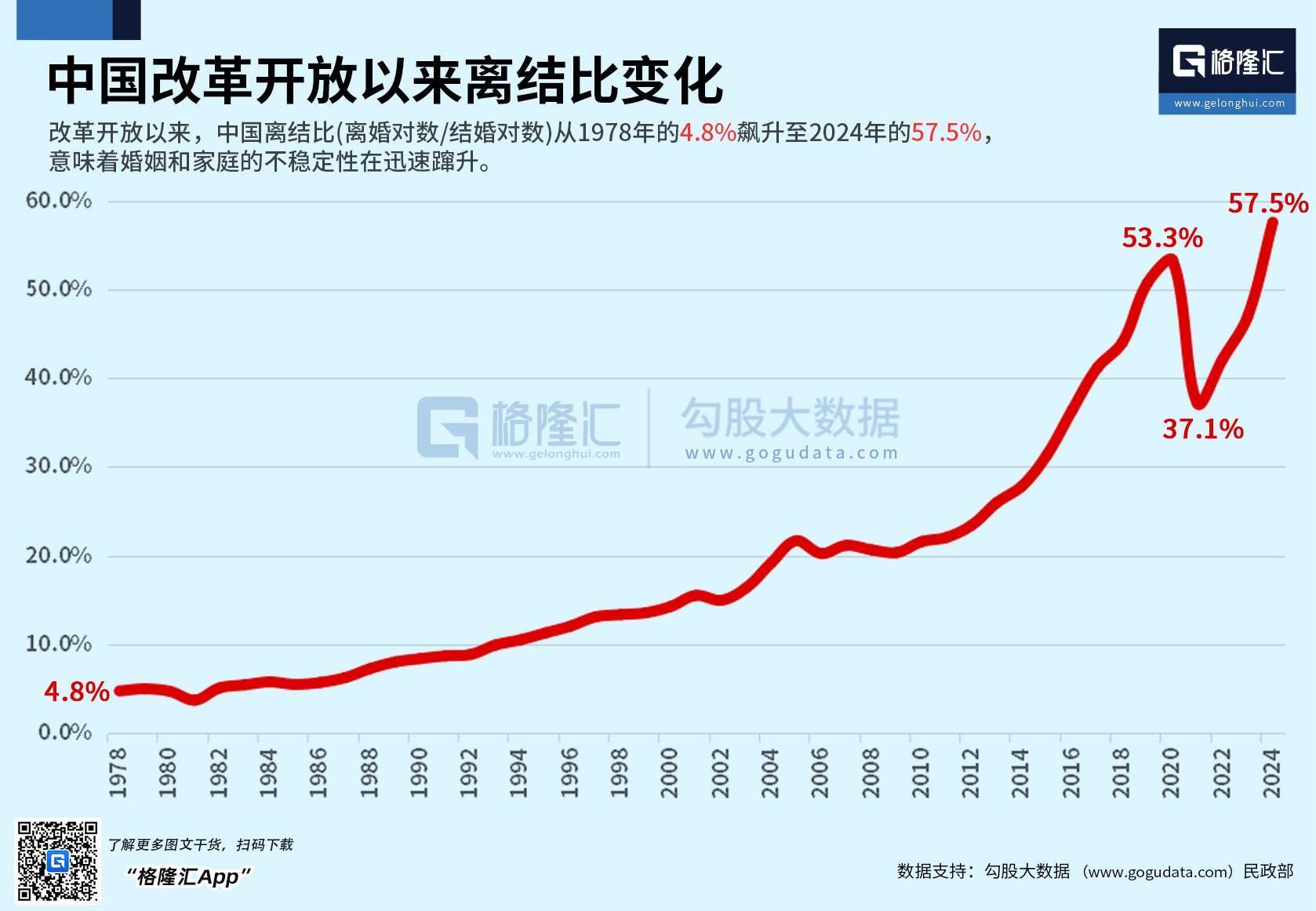 格隆汇12月1日|改革开放以来,中国离结比(离婚对数/结婚对数)从1978年的4.8%飙升至2024年的57.5%。