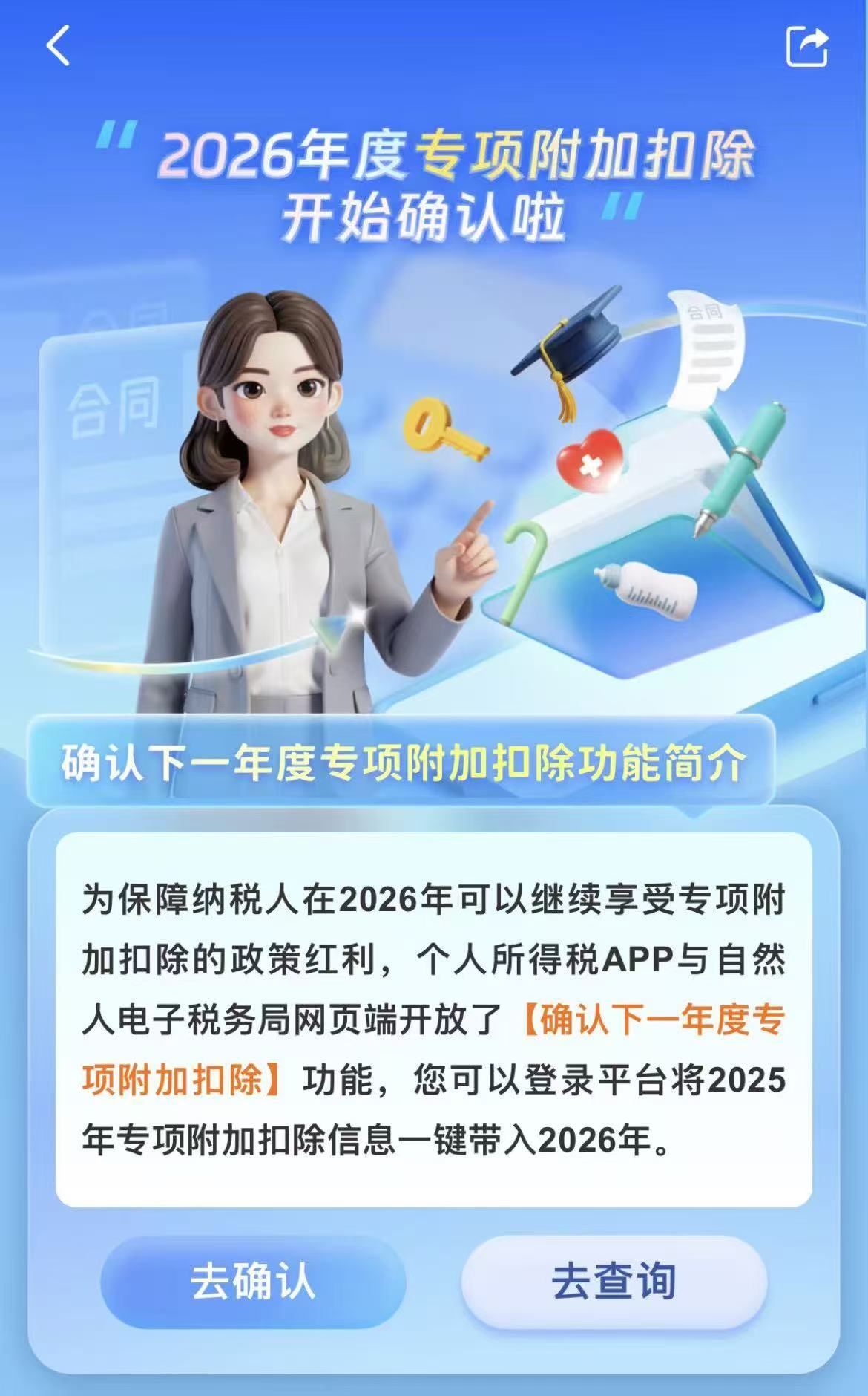 12月确认个税这项扣除 明年到手钱变多 在丁冬财经看资讯行情,选丁冬财经证券一站式开户交易>> 又到了一年一度的个人所得税专项附加扣除确认时间,而这关系到上亿人明年到手收入。 近日,国家税务总局开发的个人所得税APP首页上,已经上线2026年度专项附加扣除确认页面,老百姓在确认好明年自己适用的相关专项附加扣除信息后,就可以在明年1月起发工资后,尽早享受相关扣除,从而少缴个税,增加到手收入。 ![]() 个税专项附加扣除分别是子女教育、继续教育、大病医疗、住房贷款利息或住房租金、赡养老人、3岁以下婴幼儿照护专项附加扣除。 由于个税按一个自然年度纳税,因此每年的12月纳税人都要确认下一年度的专项附加扣除信息,其中由于大病医疗只能在第二年汇算清缴中扣除,因此无须提前确认。而其他6项专项附加扣除均需在12月份提前确认,单项扣除金额每月在400~3000元不等,确认之后才能在明年预缴个税时享受按月扣除金额,从而尽早享受减税红利。 如果明年的专项附加扣除信息跟今年一致,那么可以在个税APP页面中点击“确认下一年度专项附加扣除一键带入”,确认之后,由此则直接将你今年填报的扣除信息一键带入到2026年继续使用。 当然,如果明年相关专项附加扣除信息有变化的个人,应及时更正相关信息,避免明年无法享受相关扣除。 比如,明年有满足相关专项附加扣除条件新增或变更,常见的包括父母明年满60岁,则可以填报享受赡养老人专项附加扣除,若是独生子女一个月可享受3000元个税定额扣除。另外,子女明年满3岁,此前享受的3岁以下婴幼儿照护专项附加扣除就需要变更为子女教育专项附加扣除。 另外,如果明年不再满足一些专项附加扣除条件,也应诚信申报,不应再享受相应的专项附加扣除。 比如,子女明年大学毕业后就业,不再接受全日制学历教育,就应该及时在个税APP上录入子女教育终止时间,在这一时间之后不再享受子女教育专项附加扣除。 如果不及时退出不符合条件的专项附加扣除项目,事后一旦被查出,个人除了补缴相应税款和滞纳金外,情节严重的,不排除还会被罚款,得不偿失。 财政部数据显示,2025年前10个月,个人所得税收入为13363亿元,同比增长11.5%。这一增速明显高于全国税收收入平均增速(1.7%)。这主要与资本市场活跃、利息股息红利等财产性所得增加带动有关。 除了确认明年个税专项附加扣除信息外,事关老百姓钱袋子的个税改革也备受关注。 党的二十届三中全会提出,健全直接税体系,完善综合和分类相结合的个人所得税制度,规范经营所得、资本所得、财产所得税收政策,实行劳动性所得统一征税。 多位接受第一财经采访的财税专家表示,未来个税综合所得范围会进一步扩大,比如经营所得等可能被纳入其中,此举将解决当前劳动性所得征税不一致问题,使得个税制度更加公平,堵塞一些税收漏洞。 全新妙想投研助理,立即体验 (文章来源:第一财经) |