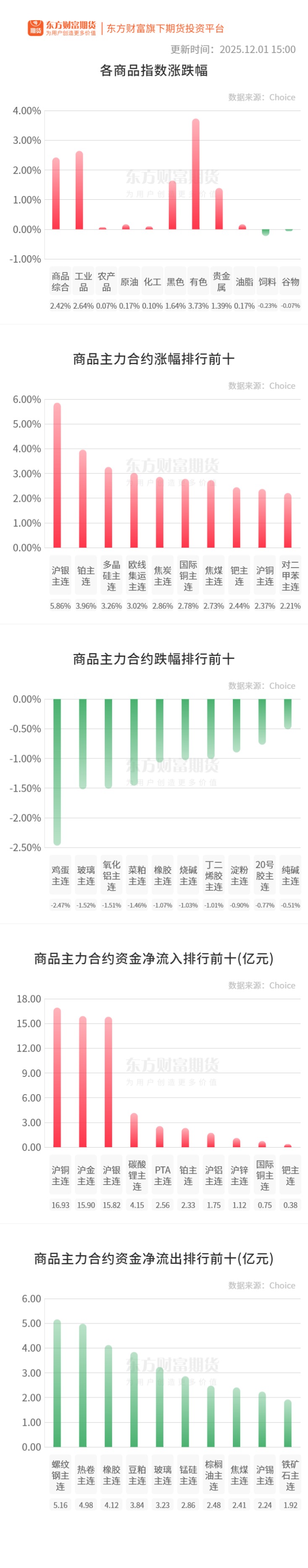 行情纵览![]() 宏观产经财联社:2025年12月1日,《中国日报》刊发工业和信息化部党组书记、部长李乐成署名文章,题为《加快中国制造绿色低碳转型促进全球可持续发展》。文章指出,加强绿色产业国际合作。中国制造将秉持共商共建原则,利用好双边和多边国际合作机制,深化绿色技术、绿色装备、绿色贸易、绿色标准等方面交流合作。鼓励中国光伏、风电、锂电池、新能源汽车等优势企业“走出去”,在“一带一路”等国家投资建设绿色能源项目,推广绿色基础设施和交通解决方案。积极参与绿色低碳国际规则制定,加强国际公约履约能力建设。 财联社:美国总统特朗普周日最新表示,他已确定美联储下任主席的人选,并将很快公布这一决定。但在接受记者采访时,特朗普拒绝证实鲍威尔的继任者是预测市场最看好的凯文·哈塞特,后者目前担任美国国家经济委员会主任。 品种资讯黑色系期货 铁矿石:2025年11月24日-11月30日中国47港铁矿到港总量2784.0万吨,环比减少155.5万吨;中国45港铁矿到港总量2699.3万吨,环比减少117.8万吨;北方六港铁矿到港总量1463.2万吨,环比增加24.9万吨。(Mysteel) 2025年11月24日-11月30日Mysteel全球铁矿石发运总量3323.2万吨,环比增加44.7万吨。澳洲巴西铁矿发运总量2765.8万吨,环比增加128.4万吨。澳洲发运量1820.5万吨,环比减少19.1万吨,其中澳洲发往中国的量1591.1万吨,环比增加37.5万吨。巴西发运量945.3万吨,环比增加147.5万吨。(Mysteel) 焦煤:对河南神火煤电股份有限公司新庄煤矿进行现场监察发现,该矿存在重大事故隐患仍然进行生产。国家矿山安全监察局河南局依法作出责令停产整顿2日的行政处罚(矿安监豫煤七罚〔2025〕303号)。(国家矿山安全监察局河南局) 农产品期货 棕榈油:据马来西亚独立检验机构AmSpec,马来西亚11月1-30日棕榈油出口量为1263298吨,较上月同期出口的1501945吨减少15.89%。(新华财经) 南部半岛棕榈油压榨商协会(SPPOMA)数据显示,2025年11月1-30日马来西亚棕榈油单产环比上月同期减少2.09%,出油率环比上月同期增加0.36%,产量环比上月同期减少0.19%。(新华财经) 豆油:监测数据显示,截止11月28日,豆油成交量为81100吨,较上周减少46900吨,其中现货成交量为6500吨,基差成交量为74600吨。豆油成交均价为8517.86元/吨,较上周下跌31.53元/吨。(中国粮油商务网) 生猪:据农业农村部监测,截至12月1日14:00时,全国农产品批发市场猪肉平均价格为17.80元/公斤,较上周五下降0.2%;鸡蛋平均价格为7.33元/公斤,较上周五下降0.3%。(新华财经) 有色/贵金属期货 白银:近年来,白银产量下降导致供应不足的缺口一直存在。全球交易所白银库存已降至近十年来低位,而光伏、电动汽车等工业领域需求持续增长,进一步加剧现货市场紧张。在租赁市场,白银短期租赁利率飙升,凸显了市场上白银供应的短缺。(央视新闻) 沪锌:12月1日,全国锌锭现货社会库存13.76万吨,较11月27日减0.28万吨,较11月24日减1.41万吨。具体来看,上海3.87万吨;广东4.53万吨;天津4.70万吨;山东0.30万吨;浙江0.17万吨;江苏0.19万吨。(Mysteel) 沪铝:据SMM统计,截至本周一(12月1日),国内主流消费地铝棒库存12.80万吨,较上周四库存下跌0.3万吨,较上周一库存下跌0.3万吨。其中,广东(佛山)铝棒库存2.40万吨,无锡铝棒库存5.95万吨,合计8.35万吨。(上海有色网) 能化期货 纯碱:截止到2025年12月1日,本周国内纯碱厂家总库存156.99万吨,较上周四下降1.75万吨,跌幅1.10%。其中,轻质纯碱73.45万吨,环比下降0.61万吨,重质纯碱83.54万吨,环比下降1.14万吨。(隆众资讯) 原木:截至11月28日,国内针叶原木总库存周环比下降6万吨或1.98%至297万方,止步4连增,同比仍高出12.81%,其中辐射松库存下降6万方至245万方,北美材库存微降创纪录新低,云杉/冷杉库存较上周持平。(木联数据) 烧碱:周末山东部分液碱散户价格继续下调,有的甚至低于主力下游采购价,且主力下游卸车不畅,送货量大,采购价在周末降20执行690。虽有省外客户计划外采,市场并未有明显好转。鲁西南32%离子膜碱主流成交700-730;鲁中东部32%离子膜碱主流成交690-750,50%离子膜碱主流成交1180-1280;鲁北32%离子膜碱主流成交700-790;鲁南32%离子膜碱主流成交770-810。(单位:元/吨)(隆众资讯) 晚间关注无 (文章来源:丁冬财经研究中心) |