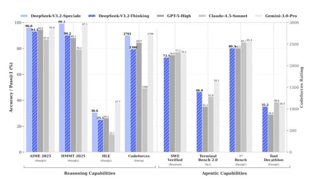 国产大模型风向标DeepSeek再发重磅新模型:重点强化智能体能力,并且融入思考和推理过程。 12月1日,DeepSeek同时发布两个正式版模型:DeepSeek-V3.2 和 DeepSeek-V3.2-Speciale,官方网页端、App和API均已更新为正式版 DeepSeek-V3.2,Speciale版本目前仅以临时API服务形式开放,以供社区评测与研究。 DeepSeek-V3.2表示,其目标是平衡推理能力与输出长度,适合日常使用,例如问答场景和通用Agent(智能体)任务场景。在公开的推理类Benchmark测试中,DeepSeek-V3.2达到GPT-5的水平,仅略低于Gemini-3.0-Pro;相比Kimi-K2-Thinking,V3.2的输出长度大幅降低,显著减少计算开销与用户等待时间。 ![]() 据DeepSeek方面介绍,DeepSeek-V3.2-Speciale 的目标是将开源模型的推理能力推向极致,V3.2-Speciale是DeepSeek-V3.2长思考增强版,同时结合DeepSeek-Math-V2定理证明能力。 DeepSeek-V3.2具备指令跟随、数学证明与逻辑验证能力,在主流推理基准测试上的性能表现媲美Gemini-3.0-Pro。 不同于过往版本在思考模式下无法调用工具的局限,DeepSeek-V3.2是首个将思考融入工具使用的模型。同时支持思考模式与非思考模式的工具调用,目前提出一种大规模Agent训练数据合成方法,DeepSeek-V3.2 模型在智能体评测中达到当前开源模型的最高水平,大幅缩小开源模型与闭源模型的差距。 值得说明的是,V3.2并没有针对这些测试集的工具进行特殊训练,所以V3.2在真实应用场景中能够展现出较强的泛化性。 在评测和成绩方面,DeepSeek-V3.2-Speciale模型获得IMO 2025(国际数学奥林匹克)、CMO 2025(中国数学奥林匹克)、ICPC World Finals 2025(国际大学生程序设计竞赛全球总决赛)及IOI 2025(国际信息学奥林匹克)金牌。其中,ICPC与IOI成绩分别达到人类选手第二名与第十名的水平。 值得注意的是,DeepSeek指出,在高度复杂任务上,Speciale模型大幅优于标准版本,但消耗的Tokens也显著更多,成本更高。目前,DeepSeek-V3.2-Speciale仅供研究使用,不支持工具调用,暂未针对日常对话与写作任务进行专项优化。 ![]() DeepSeek是当之无愧的大模型风向标,一举一动都受到行业整体关注。最近网易有道词典发布2025年度词汇——“deepseek”以 8672940次年度搜索量成功当选。据有道词典负责人介绍,“deepseek”在词典内部的搜索曲线呈现明显的爆发式特征,从年初因“低成本”突破算力封锁起,几乎每个重要进展都会带动搜索量上涨。