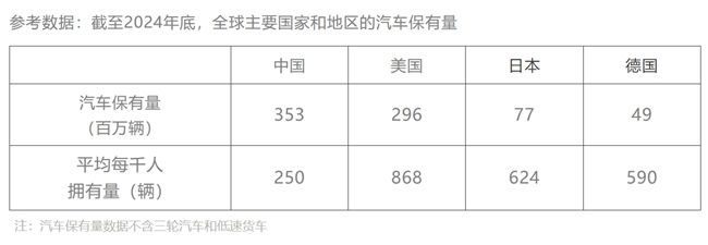 截至2024年底,中国汽车保有量已达 3.5 亿辆,其中乘用车保有量为 3.1 亿辆,同比增长 6%。自2016年以来,乘用车保有量增速逐步放缓,但增长趋势不变,预计2025年汽车保有量将突破 3.7 亿辆,乘用车保有量将达 3.2 亿辆。 汽车保有量的增长受到政策支持、经济发展、城市化进程以及技术进步等多重因素推动。综合来看,中国汽车市场的持续增长既体现了居民消费能力和经济发展的提升,也为全球汽车产业提供了新的增长引擎,并在电动化、智能化和绿色化方向引领产业转型。相比全球主要国家,中国的汽车保有量虽已居世界首位,但平均每千人拥有量仅约 250 辆,远低于美国的约 868 辆、日本的 624 辆和德国的 590 辆,表明中国市场仍有增长空间。