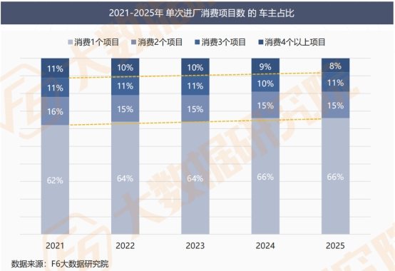 2025年,车主基础保养间隔时长继续后移:间隔9个月及以上才进厂保养的车主占比达45%,较2024年提升2个百分点;间隔月份中位数目前稳定在8个月左右,但仍呈后移态势。 从保养间隔里程来看,变化同样突出:2023年之前,车主基础保养间隔里程中位数集中在7,000-8,000公里,而近2年这一中位数已后移至8,000-9,000公里,间隔里程显著拉长。 车主基础保养的时间与里程间隔持续拉长,将直接带来进店频次的降低。这一变化不仅减少了维保门店与车主的接触机会,且间接削弱了轮胎更换、底盘检修、油液升级等衍生维保业务的转化可能,成为汽车后市场各类业务台次下滑、多品类销量承压的关键诱因之一。 十、精简业务需求的进厂台次 精简业务需求的进厂台次占比持续提升,(进厂仅消费一个服务项目),反映出车主消费需求的精准化(节省化)倾向。