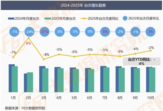 2025年乘用车轮胎市场中,传统动力车型以 90% 的销量规模占比占据绝对主导地位。 从品牌竞争来看,国产品牌与外资品牌在不同动力类型赛道呈现差异化态势,具体表现为: 传统动力车型市场:国产品牌优势持续深化,销量占比从2023年的50%稳步提升至2025年的54%,三年累计增长4个百分点。 新能源车型市场:外资品牌呈“跌落回升”的反转态势。2023-2024年国产品牌占比从57%升至59%,外资品牌份额承压下滑;但2025年外资品牌实现反弹,国产品牌占比回落至56%。 值得关注的是,尽管新能源车型当前整体市场规模占比仍处于较低水平(10%),但该细分赛道呈现的“外资反转”态势,依然具有不容忽视的关键意义。这一趋势清晰展现出外资品牌在新能源专用轮胎核心技术研发、车企战略合作资源整合等领域的后发调整与快速适配能力。展望未来,随着新能源汽车渗透率的持续提升,新能源专用轮胎市场规模将逐步实现扩大,而该赛道品牌竞争格局的动态变化,也将成为影响乘用车轮胎市场整体发展走向的重要变量。 七、后市场各月台次 剔除春节因素,2025年后市场各月台次均同比下跌,但当前月度同比降幅已明显收窄,截至10月,累计台次YTD同比下滑4%。