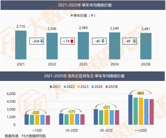 2025年,车主在车辆维保过程中的消费行为呈现出更明显的“精简化”特征:单次进厂消费4个及以上项目的车主占比进一步降至8%,这一数据不仅创下新低,更延续了近三年来持续下滑的走势,反映出多项目打包消费的模式正逐渐被车主摒弃。 这一鲜明的行为变化背后,是车主消费理念的深度转变:如今车主进厂维保的需求正趋于简约,每一次消费的目的性愈发鲜明―多为解决特定车辆问题或完成必要保养,而非被动接受额外服务。这也意味着,过去依靠“捆绑营销”、“项目叠加”推动消费的传统模式,已难以契合当下车主理性、聚焦的决策逻辑,对维保服务方的精细化运营提出了更高要求。 十一、单车年均维保价值 近2年,单车年均维保价值呈现小幅下降态势,缩减用车成本已成为全体车主普遍的共性趋势,30万元以上高单价车型的年度维保价值仍然最高。