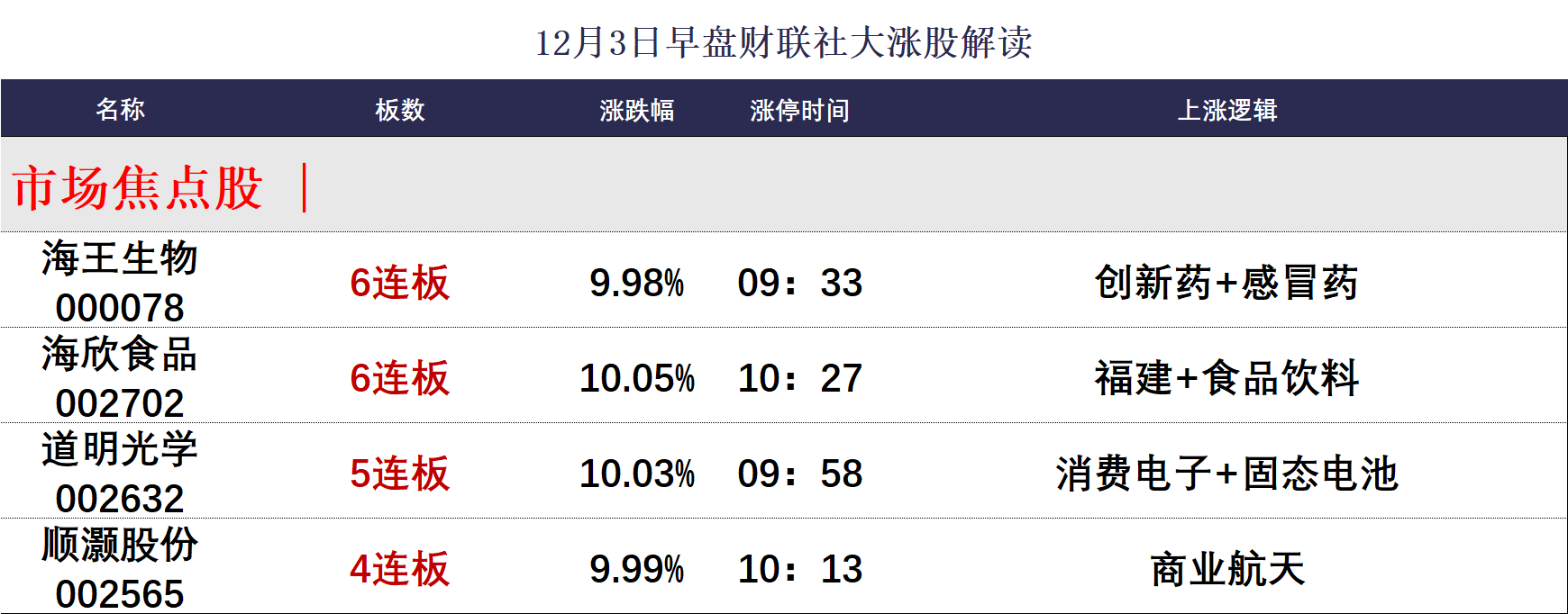 今日午盘全市场共35股涨停,连板股总数9只,22股封板未遂,封板率为61%(不含ST股、退市股)。焦点股方面,流感防治概念股海王生物6连板,福建本地股海欣食品6连板,消费电子板块道明光学5连板,商业航天概念股顺灏股份4连板。