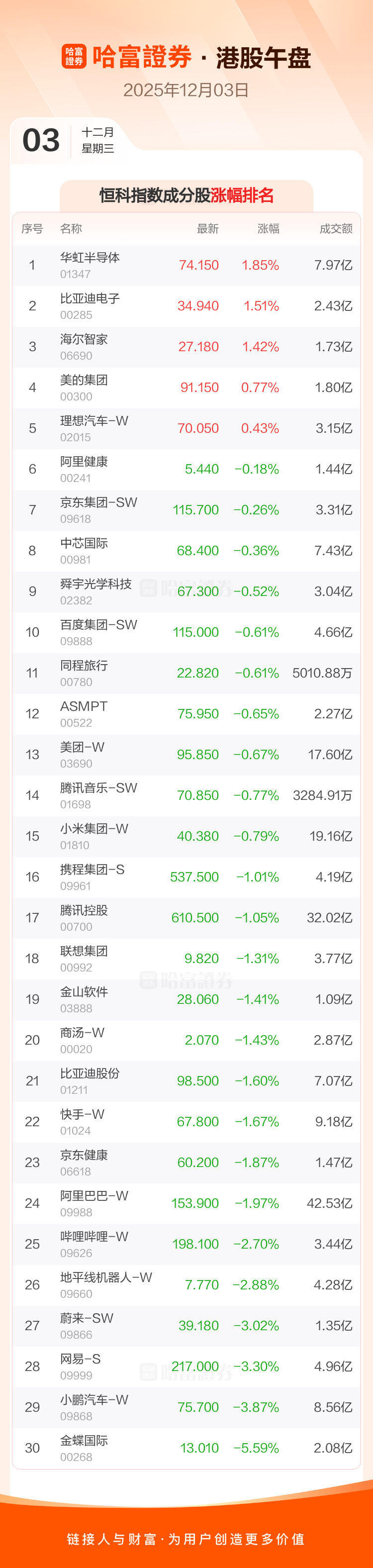 港股12月3日午盘走低 ,恒生指数收报25843.01点,跌252.04点,跌幅0.97%;恒生科技指数收报5551.14点,跌72.9点,跌幅1.3%。恒生指数成分股中创科实业、中国宏桥、万洲国际涨幅居前,网易-S、农夫山泉、恒基地产跌幅靠前。恒生科技指数成分股中华虹半导体、比亚迪电子、海尔智家涨幅居前,金蝶国际、小鹏汽车-W、网易-S跌幅靠前。