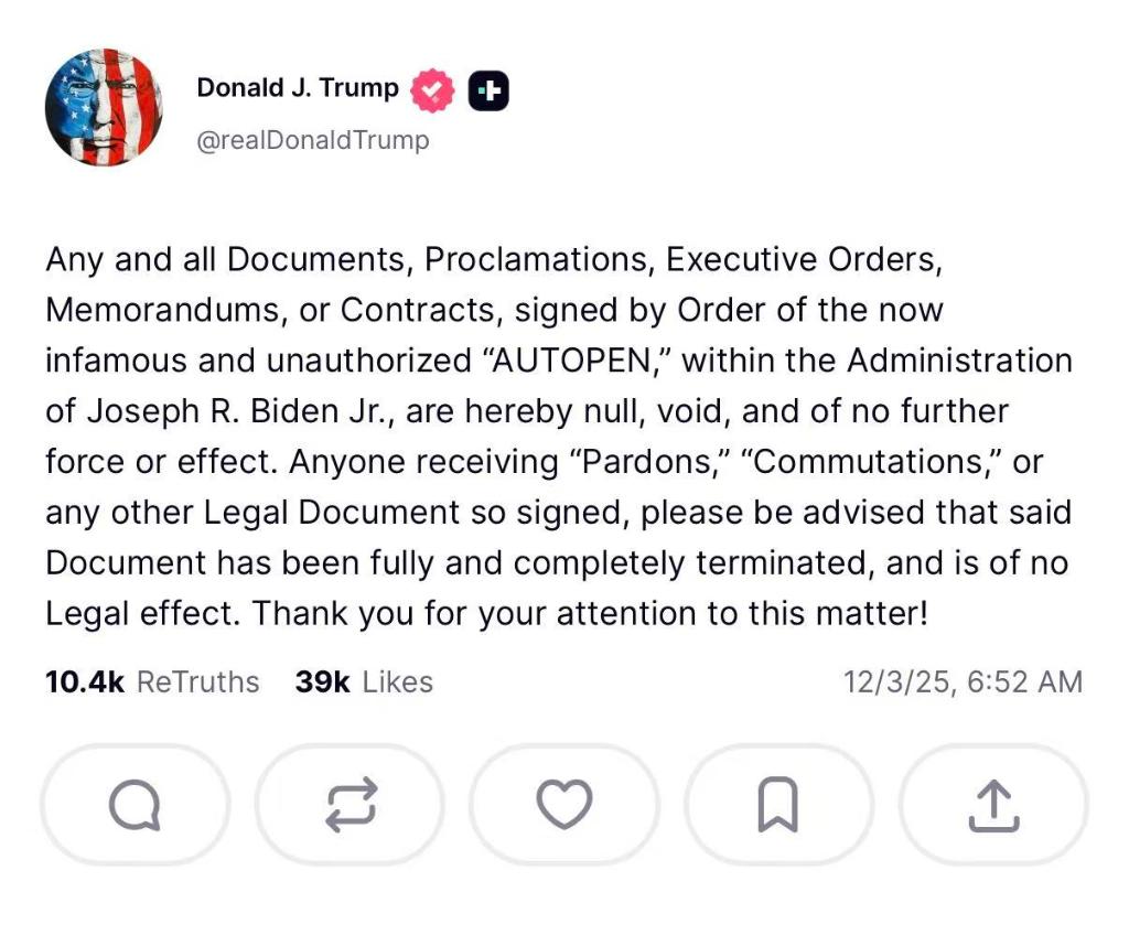 特朗普:拜登用自动签名笔签署的赦免令无效! 炒股第一步,先开个股票账户 美国总统特朗普2日说,他将终止前总统拜登用自动签名笔签署的所有文件的有效性,包括赦免令。 特朗普当天在社交平台“真实社交”上发文说:“任何收到以该方式签署的‘赦免令’‘减刑令’或其他任何法律文件的人请注意,上述文件已被完全终止,不具备任何法律效力。” ![]() 特朗普在“真实社交”上的发文截图。 自动签名笔是一种能精准复制个人签名的设备,通常用于签署大批量或仪式性的文件。据路透社报道,美国民主、共和两党的总统都曾使用该设备签署信件和公告。特朗普及其支持者却坚持认为,拜登在任期间使用该设备签署的行政令无效,还暗示拜登对这些行政令并不完全知情。目前尚不清楚拜登是否曾使用自动签名笔签署过赦免令。 特朗普今年1月20日宣誓就职。拜登在卸任前最后一刻宣布,“预防性”赦免“国会山骚乱”众议院特别调查委员会成员等人,以防止特朗普上台后对他们进行报复。获赦免人员还包括拜登的5名亲属。 3月17日,特朗普在社交媒体上发文称,因为上述赦免令由自动签名笔而非拜登本人签署,且拜登“对此一无所知”,这些赦免令无效。特朗普在帖文中并未给出上述判断的根据。 据美联社和美国《华盛顿邮报》先前报道,美国保守派智库传统基金会的“监督项目”人员3月曾表示,他们通过分析数千页包括拜登签名的文件判断,拜登在包括赦免令在内的大部分文件上的签名都由自动笔完成。 “监督项目”负责人迈克·豪厄尔援引美国宪法相关规定称,赦免权只由总统享有,不得授权给他人或机器。此后,一些保守派媒体不断炒作相关话题,特朗普本人也多次谈及自动签名笔。特朗普承认自己也用自动笔签名,但“只用于非常不重要的文件”。 针对豪厄尔的说法,有美国媒体指出,其团队分析用的文件并非纸版原件而是电子文件,只包含数字签名而非原始签名,因此难以判断是否用了自动签名笔。 美国司法部2005年曾出台法律意见,明确总统使用自动签名笔不存在法律争议。早在1929年,时任司法部副部长惠特写给司法部长的一份备忘录指出,赦免令并非必须由总统签署,美国宪法等法律未明确规定总统如何行使赦免权,“全由总统决断”。 (文章来源:新华网) |