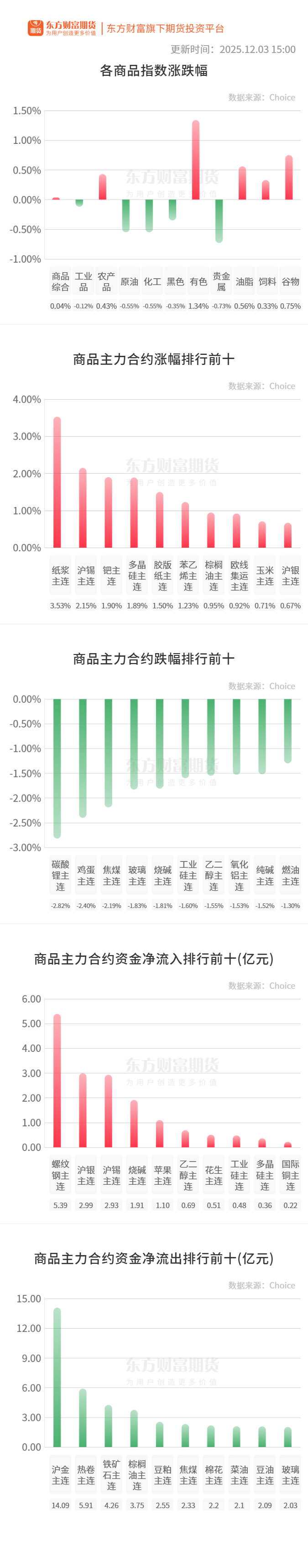 行情纵览![]() 宏观产经央视新闻:记者从商务部了解到,今年1—11月,消费品以旧换新带动相关商品销售额超2.5万亿元,惠及超3.6亿人次。其中:汽车以旧换新超1120万辆,家电以旧换新超12844万台,手机等数码产品购新补贴超9015万件,电动自行车以旧换新超1291万辆,家装厨卫“焕新”超1.2亿件。 新华社:在爱尔兰访问的乌克兰总统泽连斯基12月2日说,他担心美国会对乌克兰和平进程失去兴趣。在当天与爱尔兰总理马丁举行的联合新闻发布会上,泽连斯基说,他对美国为寻求解决乌克兰危机所作的努力持乐观态度,认为这源于美方对此事的兴趣。“美国现在没有放弃任何形式的外交对话,这是件好事。”但当被问及是否担心美国对谈判进程失去兴趣时,泽连斯基承认:“是的,我担心。” 品种资讯黑色系期货 铁矿石:巴西淡水河谷公司表示,公司已对多项预期作出更新,其中2026年铁矿石产量将介于3.35亿至3.45亿吨,低于此前给出的3.4亿至3.6亿吨区间。(财联社) 钢材:截止12月3日当周,据找钢网数据显示,全国建材产量435.09万吨,较上周减少6.58万吨;厂库375.36万吨,较上周减少18.81万吨;社库447.79万吨,较上周减少23.17万吨;总库存823.15万吨,较上周减少41.98万吨;表需477.07万吨,较上周减少4.96万吨。(找钢网) 农产品期货 棕榈油:路透公布调查显示,马来西亚11月份原棕榈油产量估计为198万吨,较10月份下降3%;出口预计为144万吨,较10月份下降14.9%;11月期末库存预计为266万吨,较10月增长7.78%。(新华财经) 淀粉:本周华北玉米淀粉个别企业继续提产增量,整体玉米淀粉行业开机率小幅升高。 本周(2025年11月27日-12月3日)全国玉米加工总量为62.68万吨,较上周增加0.22万吨;周度全国玉米淀粉产量为32.49万吨,较上周产量增加0.15万吨;周度开机率为61.66%,较上周升高0.28%。(Mysteel) 白糖:2025年11月15日广西首家制糖企业开榨,正式拉开广西2025/26榨季生产序幕。截至11月30日广西已有35家糖厂开榨,同比减少26家;累计入榨甘蔗144.11万吨,累计产糖13.39万吨,同比减少37.85万吨;累计产糖率9.29%,同比下降1.63个百分点。截至11月30日广西累计销糖8.94万吨,同比减少19.56万吨;产销率66.77%,同比提高11.15个百分点。新糖工业库存4.45万吨,同比减少18.29万吨。(广西糖业协会) 有色/贵金属期货 多晶硅:展望12月,根据各企业排产计划,国内多晶硅产量预计仍将维持在12万吨以内,环比小幅回升,增量主要来自通威等企业的检修复产以及其他企业的复产爬坡。同期需求端预期更为疲软,硅片、电池片、组件各环节为应对高库存和终端需求不足,计划进一步加大减产幅度。因此,在硅料端开工率相对平稳而下游需求加速走弱的情况下,预计12月多晶硅市场累库趋势仍将延续。(中国有色金属工业协会硅业分会) 碳酸锂:智利海关公布的数据显示,智利11月锂出口量为20006吨,其中碳酸锂出口量为17963吨。当月对中国出口碳酸锂14693吨。(Mysteel) 沪铅:华中地区某冶炼厂透露,因粗铅富含金属量有限,其加工费未随铅精矿加工费同步下滑,目前仍保持在300—400元/吨的水平。鉴于铅矿供应存在短缺,该冶炼厂倾向于在铅价走低时适量补充粗铅库存。(SMM) 能化期货 甲醇:截至2025年12月3日,中国甲醇港口库存总量在134.94万吨,较上一期数据减少1.41万吨。其中,华东地区累库,库存增加0.13万吨;华南地区去库,库存减少1.54万吨。(隆众资讯) 聚酯:据中国贸易救济信息网,12月2日,巴西外贸委员会管理执行委员会发布2025年第820号决议,鉴于国内公共利益的原因,决定取消对原产于或进口自中国生产商/出口商义乌华鼎锦纶股份有限公司的尼龙长丝征收临时反倾销税。决议自发布之日起生效。(财联社) 晚间关注21:15 美国:ADP就业人数(非农私营):新增就业:季调 21:30 美国:供应管理协会(ISM):服务业PMI:季调 (文章来源:丁冬财经研究中心) |