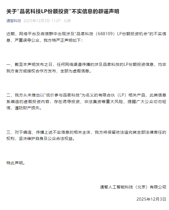 炒股第一步,先开个股票账户 近日,21财经《辟谣财知道》注意到,网络平台及微信群中流传出“品茗科技LP份额投资机会”等不实信息。 12月3日,通智科技严正声明,称从未推出以“低价参与品茗科技”为名义的有限合伙(LP)相关产品,此类信息系编造的虚假投资内容,存在诱导投资、非法集资等重大风险,提醒广大公众切勿轻信,谨防财产损失。通智科技强调,截至本声明发布之日,任何网络渠道传播的涉及品茗科技的LP份额投资信息,均非通智科技官方或授权合作方发布,全部为虚假信息。 ![]() 此前,通智科技通过股权转让成为5倍大牛股品茗科技(688109.SH)的第二大股东,受到市场广泛关注。9月24日,品茗科技发布公告称,该公司与通智科技的下属投资主体通智清研签署了《股份转让协议》,向通智清研受让无限售流通股1255.22万股,占总股本的15.92%,转让价格为人民币39.50元/股,转让价款合计人民币4.96亿元。 诈骗分子或是截取并歪曲了上述信息,借着市场热度,以通智科技的名义捏造出面向公众的“私募份额”或“LP投资机会”,利用信息差实施诈骗。 关于上述股权转让进展,21财经·南财快讯记者以投资者身份致电品茗科技,公司证券部工作人员确认,前述股份转让“流程还没走完,份额还没有过户”,具体完成时间待定,股份转让完成后将发布公告。 通智科技表示,对于编造、传播上述不实信息的相关主体,公司将保留依法追究其全部法律责任的权利,坚决维护自身及公众合法权益。 截至14:24,品茗科技涨1.07%,报156.51元/股,总市值为123亿元,年内股价涨超550%。 (文章来源:21世纪经济报道) |